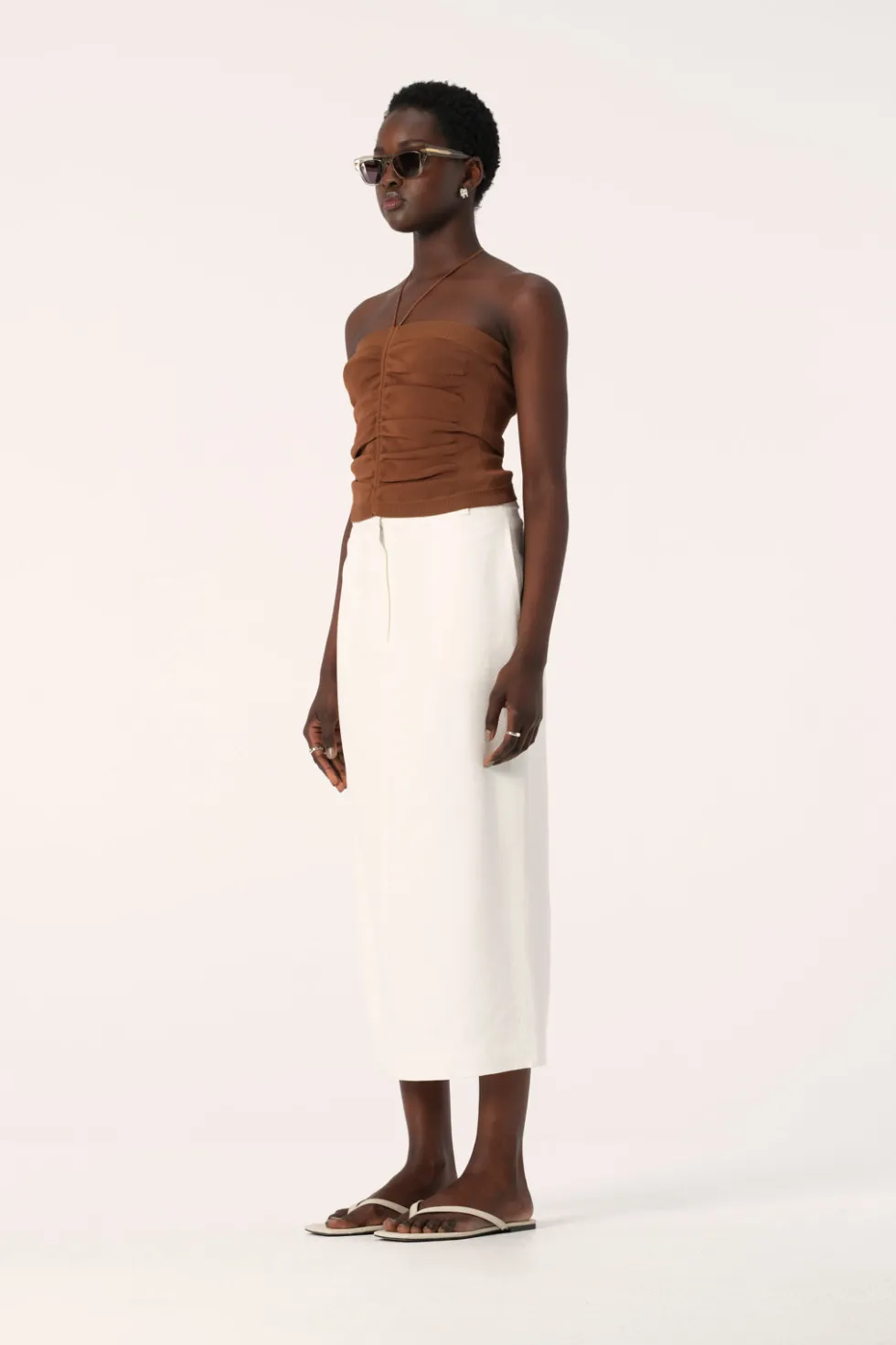 Veering from their signature fitted knit silhouettes, the Mariolu Halter Top from Elka Collective makes quite the statement for day or night time outfitting. Made from a stretch viscose-nylon knit fabric, the Mariolu Top is lightweight for wearing in any season and features a straight neckline with string ties and centre front ruching detail that adds texture and dimension to an otherwise simple and elegant design.