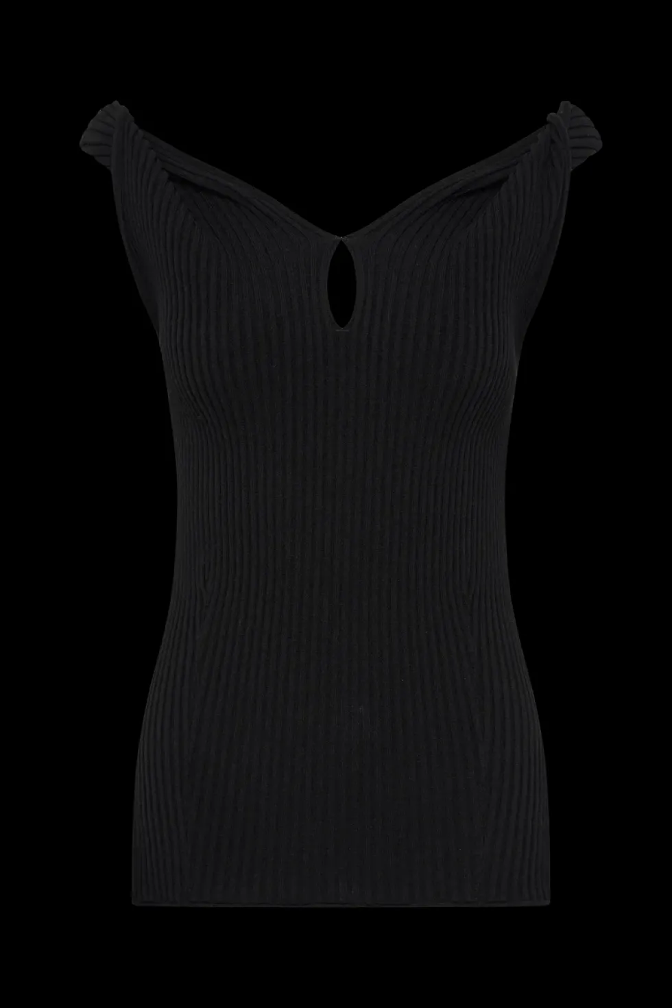 An off-shoulder top with a twist detail that sits high on the upper arms. Featuring a keyhole cut out at the front neckline, it is fitted through the body, yet still offers some stretch and movement. Designed from a unique blend of true knitwear and linen, it is intended for transeasonal occasions when paired with a classic black trouser.