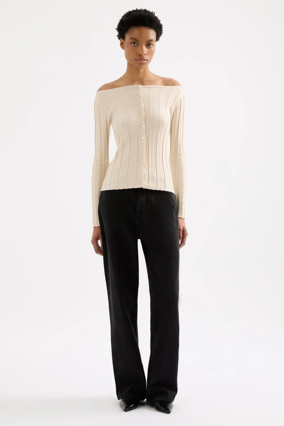 The Aneke Knit Top from Nude Lucy is made from a lightweight cotton blend yarn which is soft in feel. The silhouette is slim fitting with full length sleeves and its length sitting at hip level. Features include wide rib pattern construction through the body, boat neckline and shell buttons.