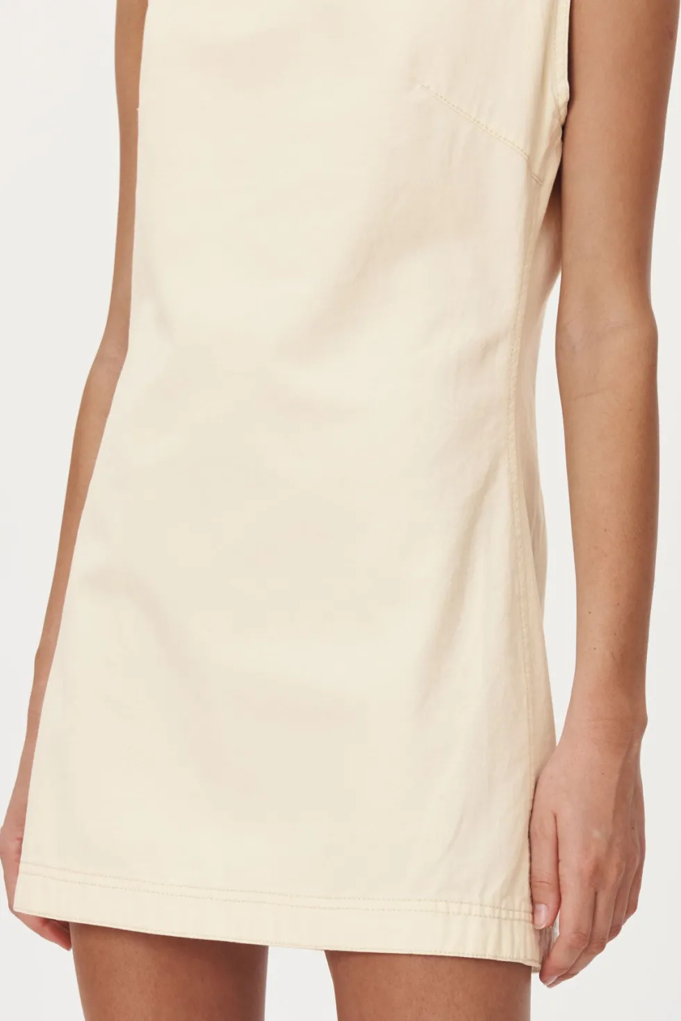Lightweight shift mini dress Asymmetrical shoulders Exposed metal zip with pull tie Heavy topstitch and denim detailing Back darts for a tailored fit