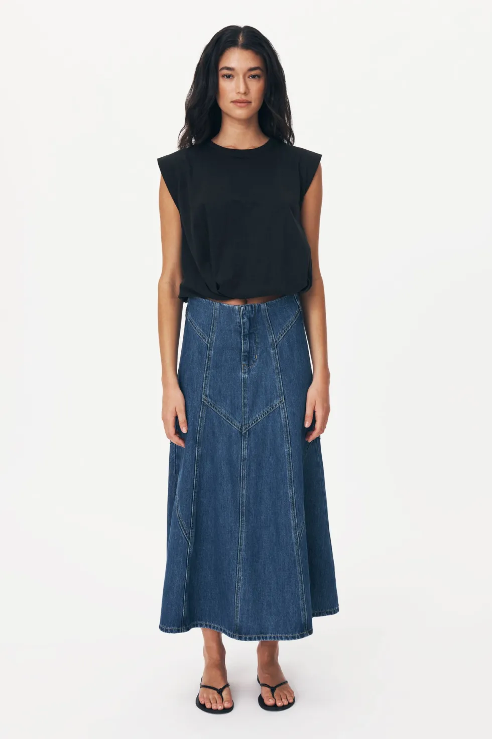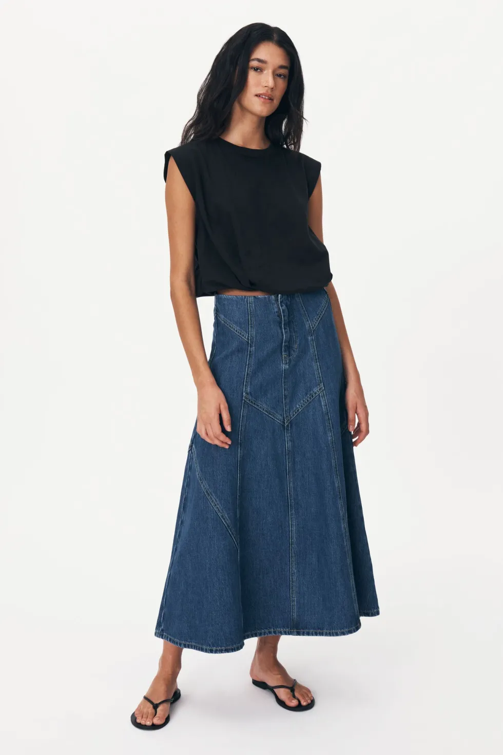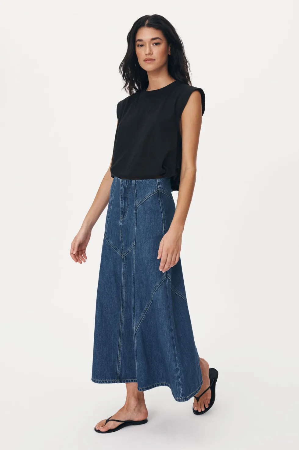 The Jeanette Denim Midi Skirt – With heavy topstitch detailing and a soft vintage feel. Jeanette is an endlessly versatile and flattering piece to take you from season to season. Style with the Mason Silk Shirt for an elevated look, or pair it back with the Hubert Knit Tank.
