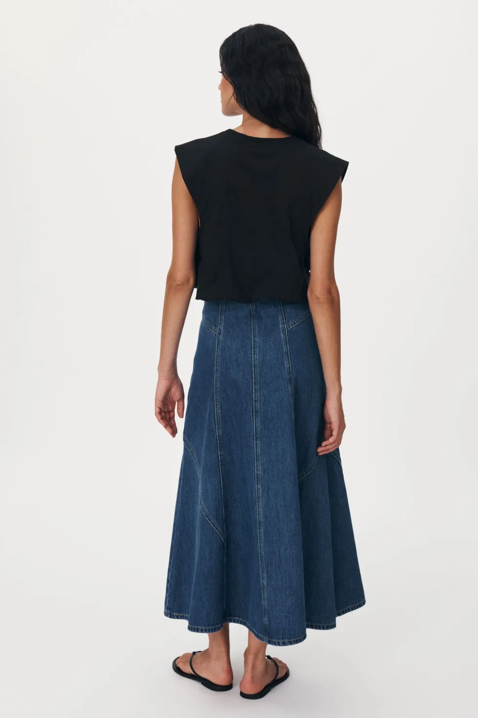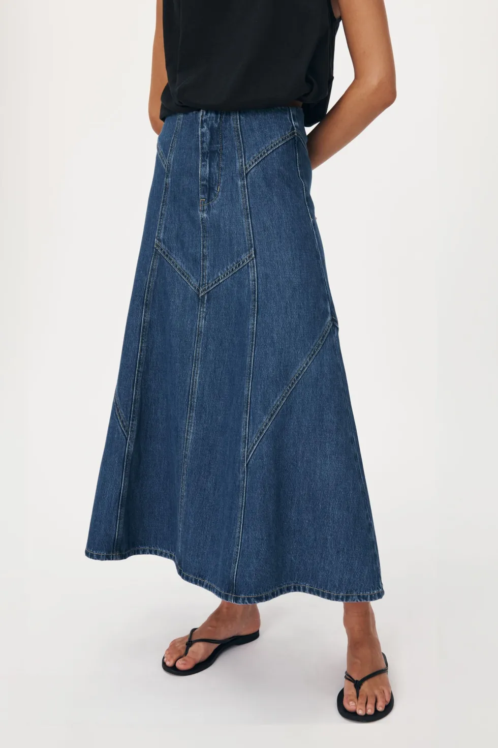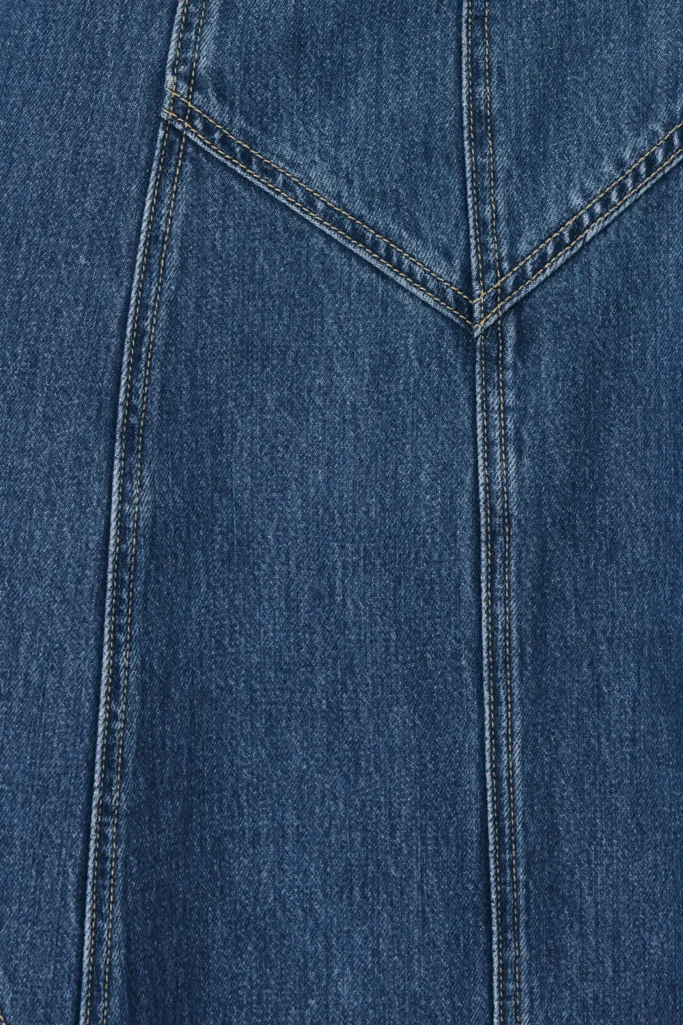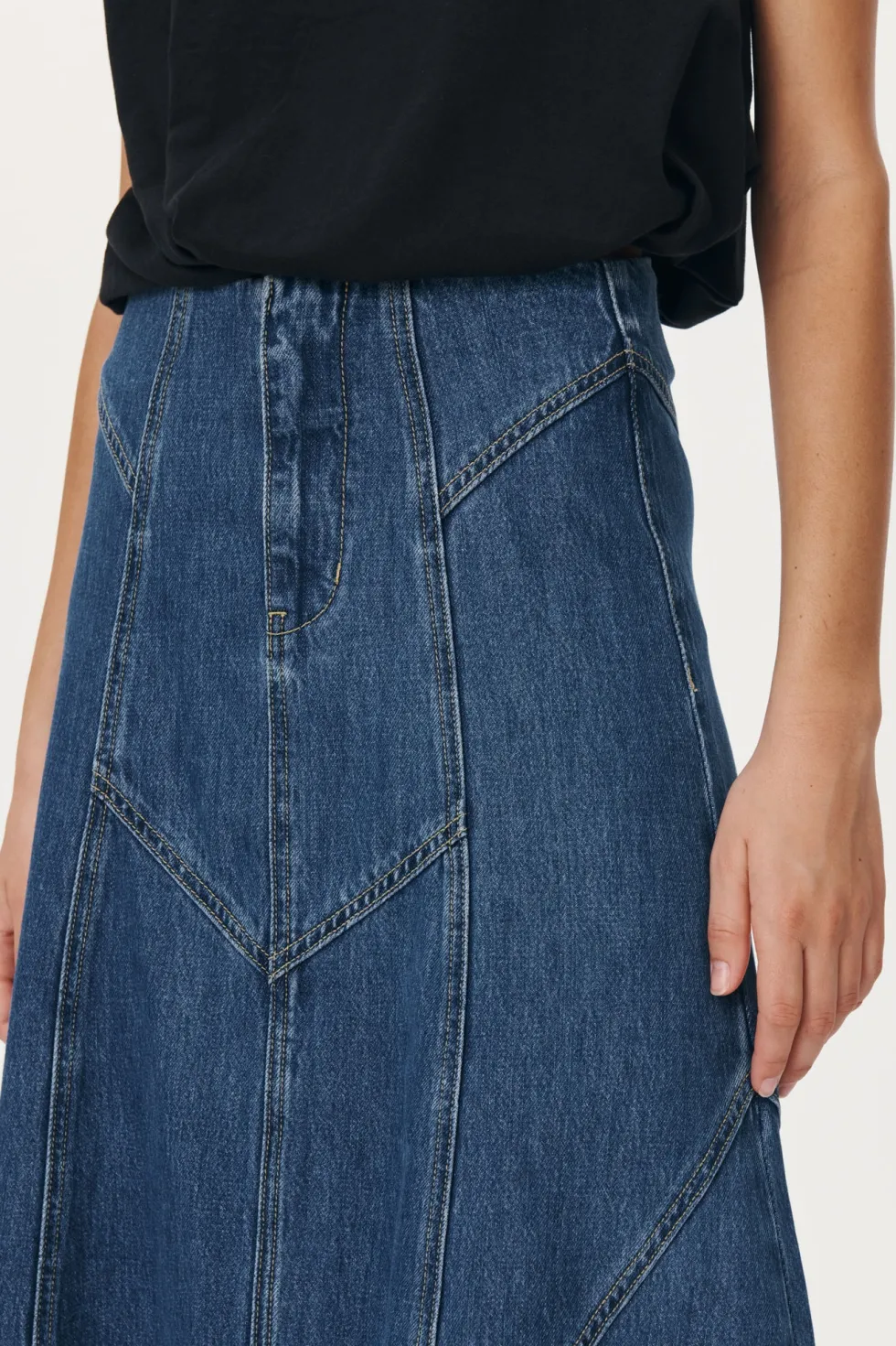 Mid-weight Denim panelled midi skirt Heavy topstitch Soft, vintage-worn feel in a faded blue wash Denim is designed to fade