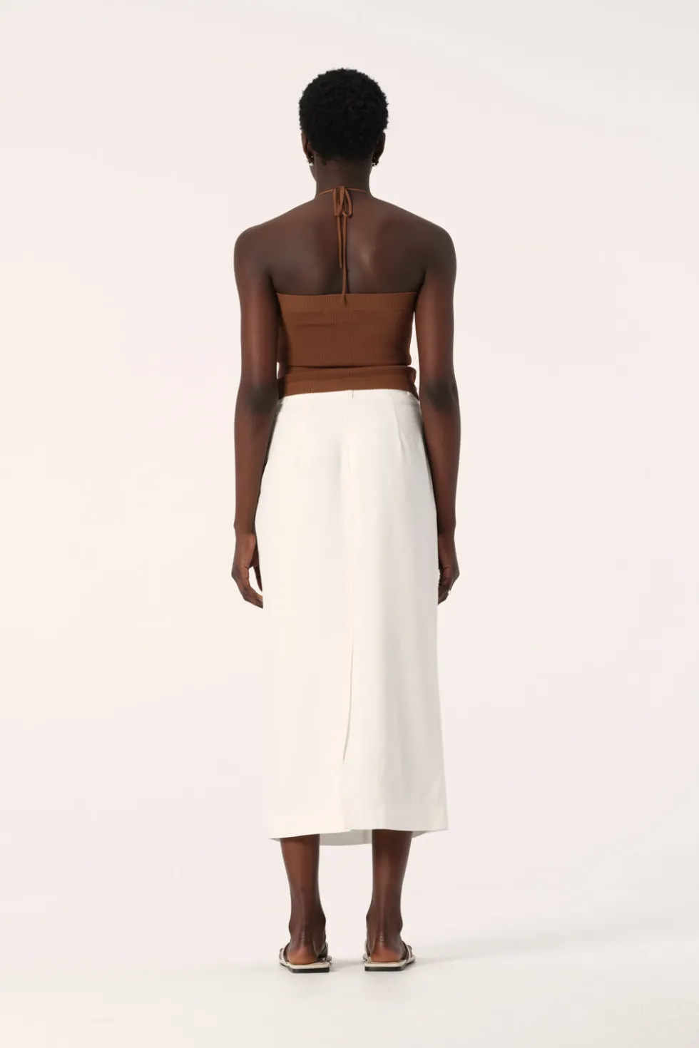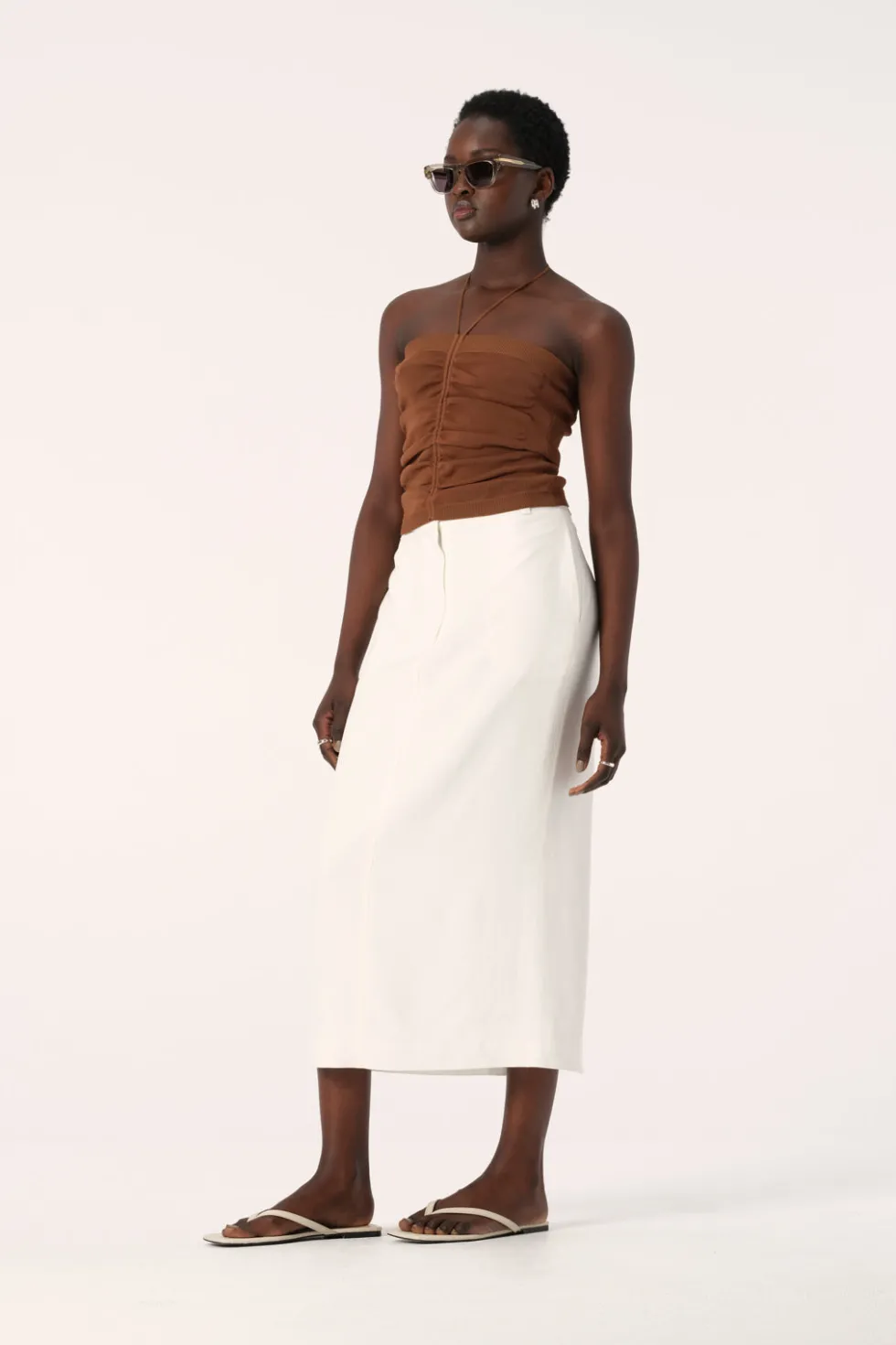 Veering from their signature fitted knit silhouettes, the Mariolu Halter Top from Elka Collective makes quite the statement for day or night time outfitting. Made from a stretch viscose-nylon knit fabric, the Mariolu Top is lightweight for wearing in any season and features a straight neckline with string ties and centre front ruching detail that adds texture and dimension to an otherwise simple and elegant design.
