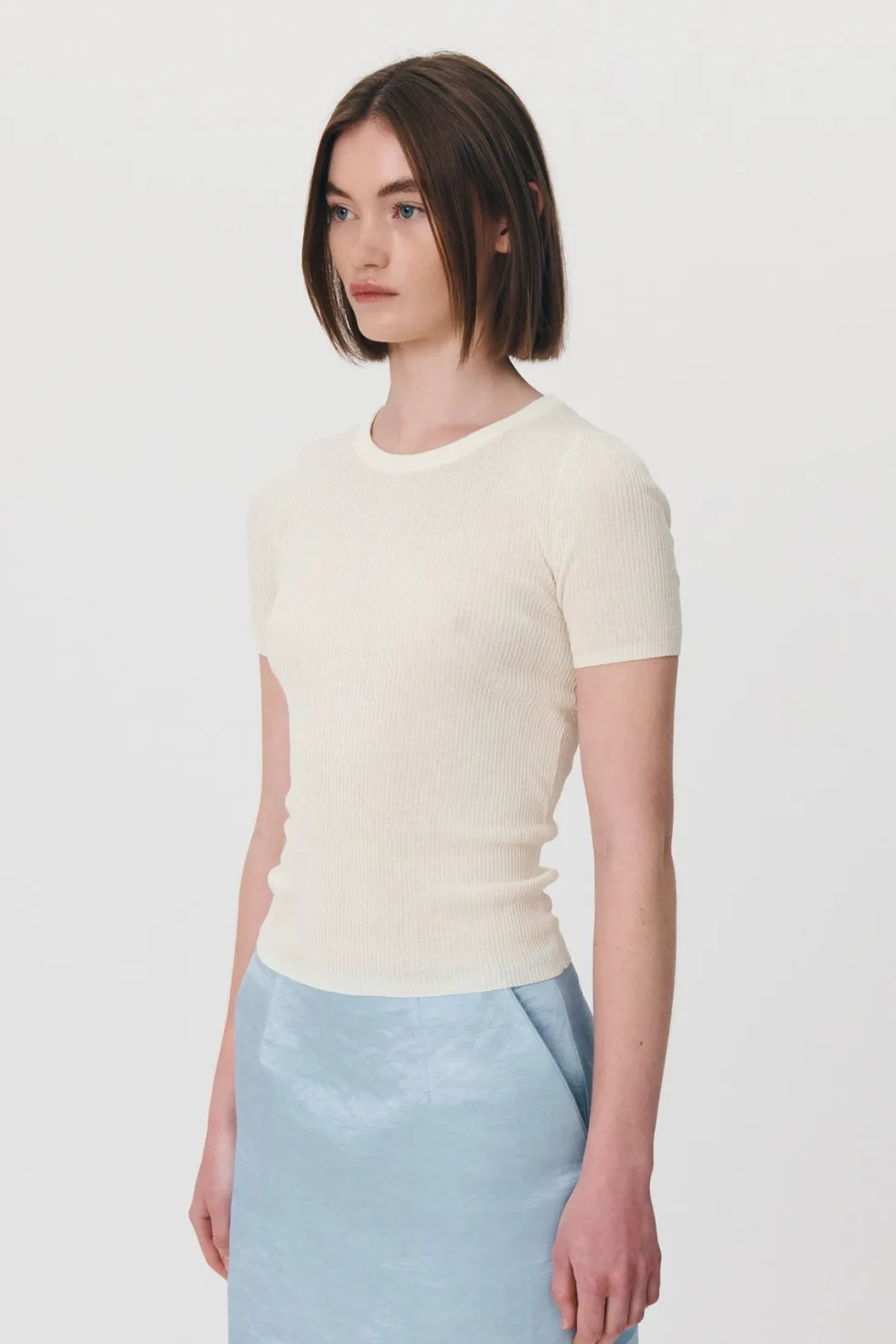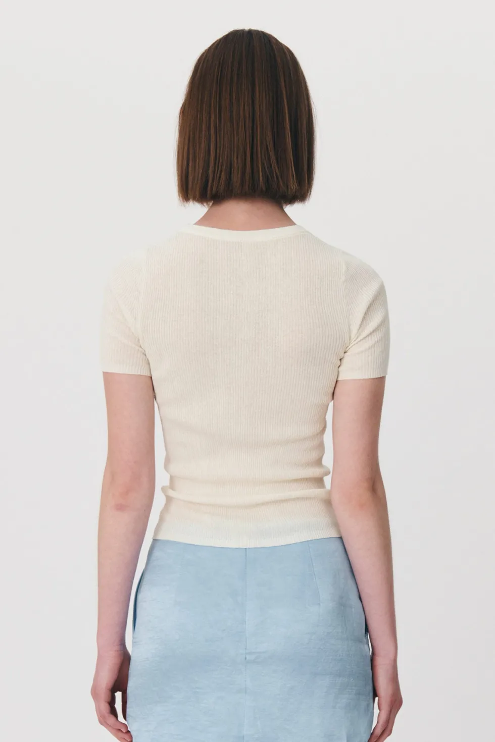 Introducing the Rib Knit Tee in Bone – your go-to choice for timeless layering. The Rib KnitTee features short sleeves, a body-hugging second-skin fit, and is expertly crafted from superfine cotton.