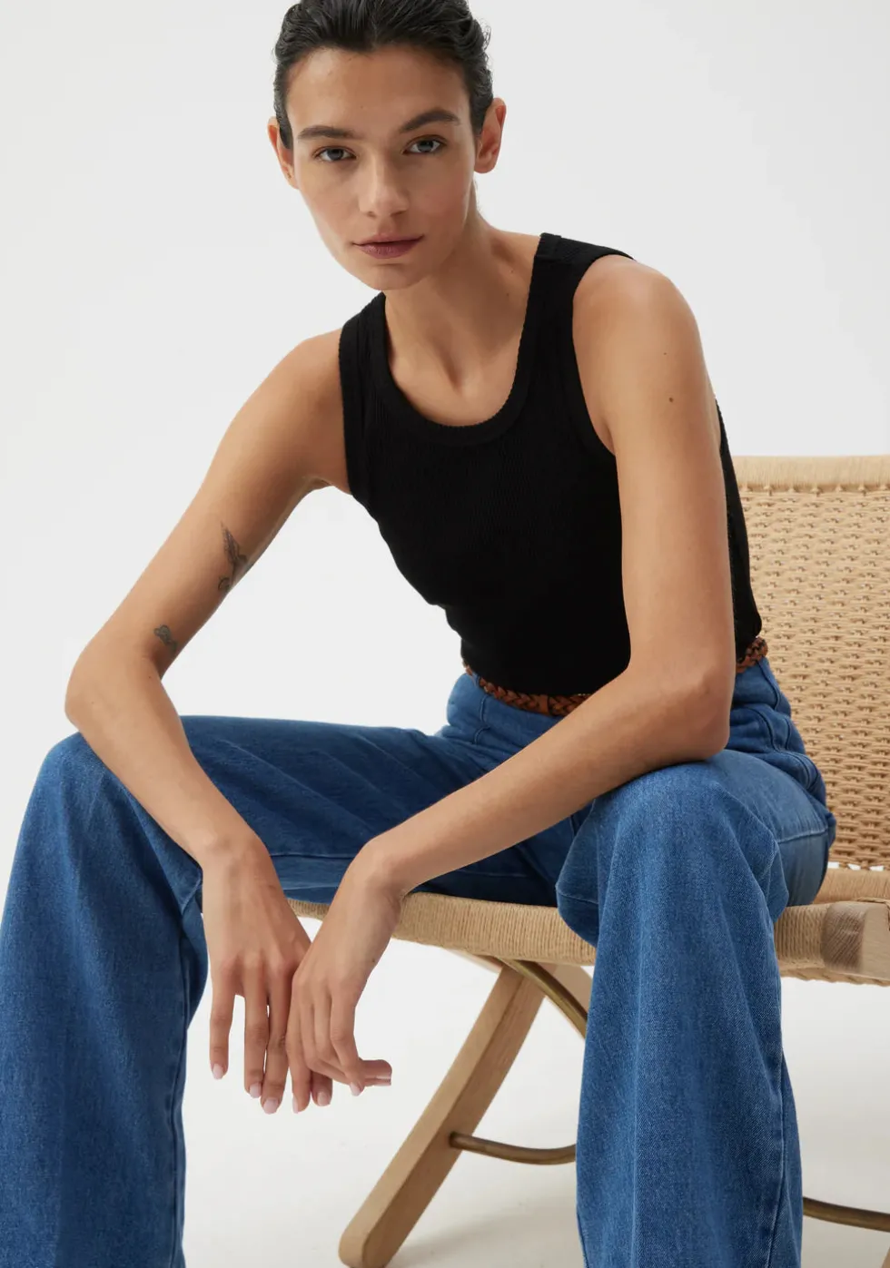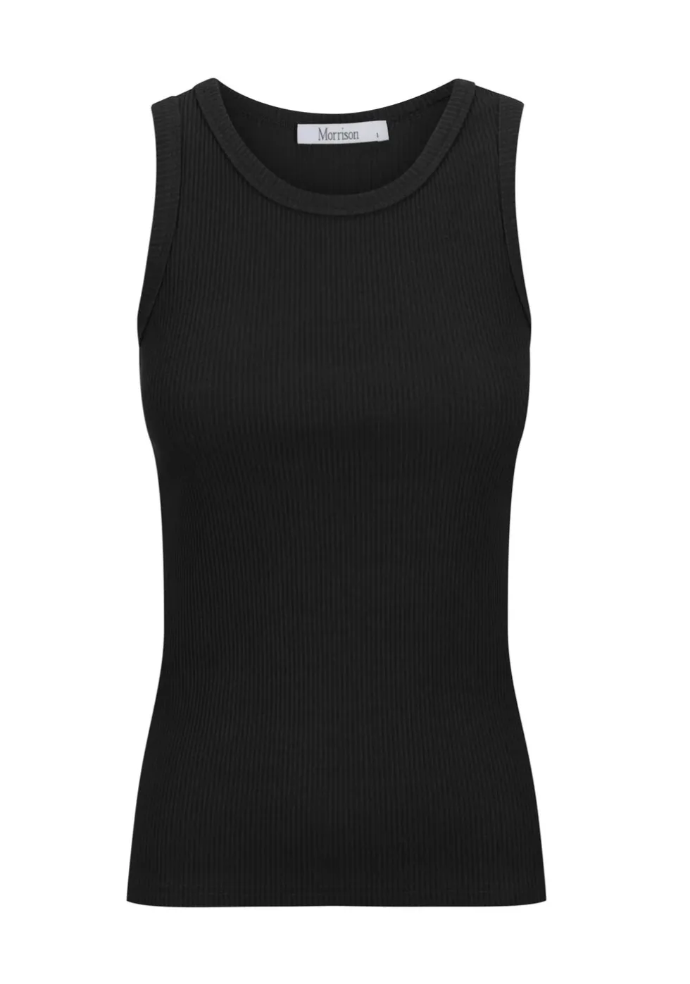 Cassie Tank in Black by Morrison is a stretch cotton rib classic tank. Featuring a crew neckline and straight hem, this tank is bind at the neck & armhole and fitted through the body.