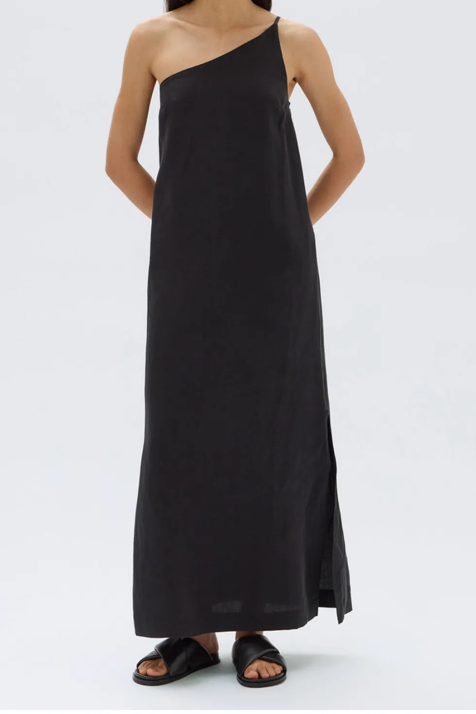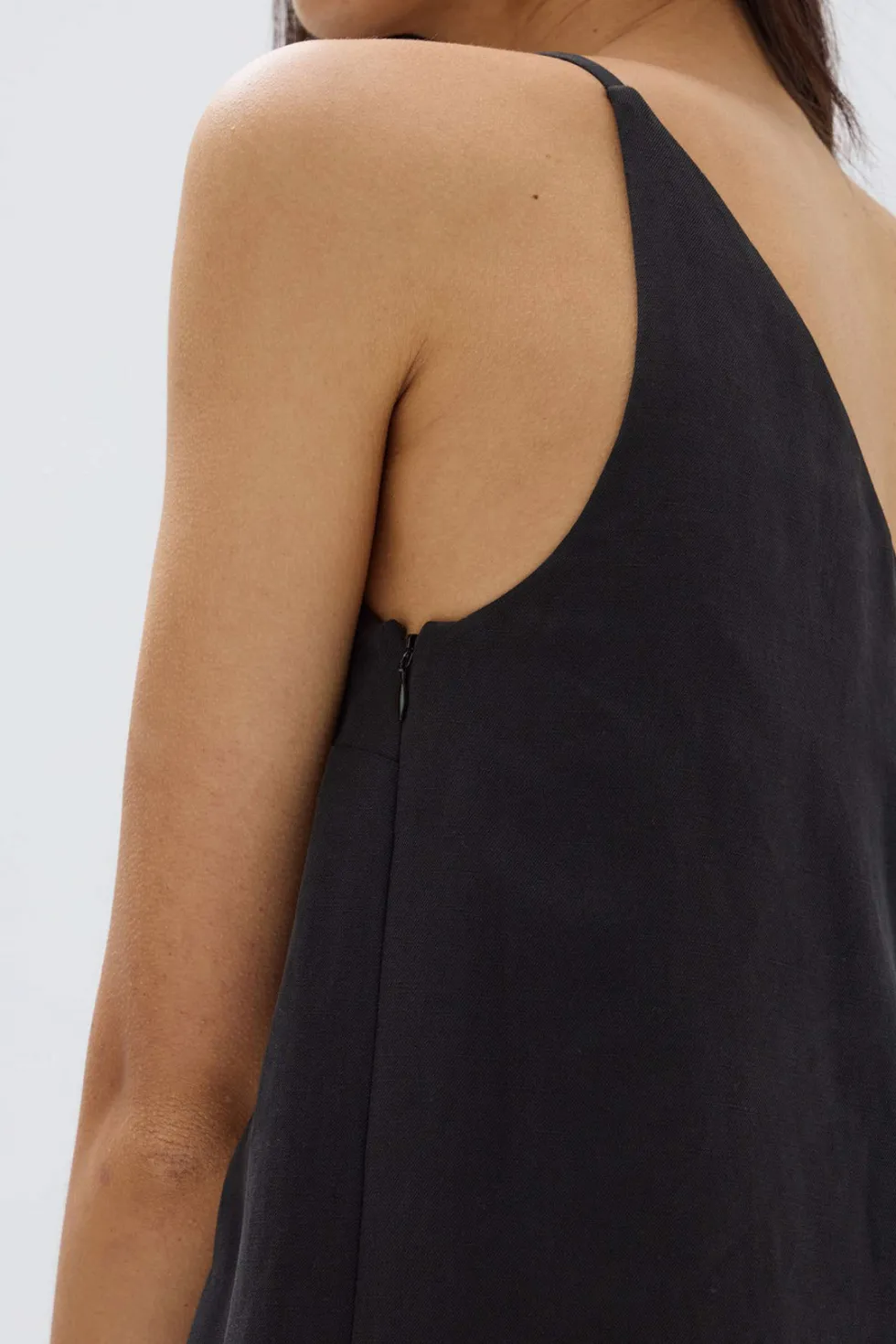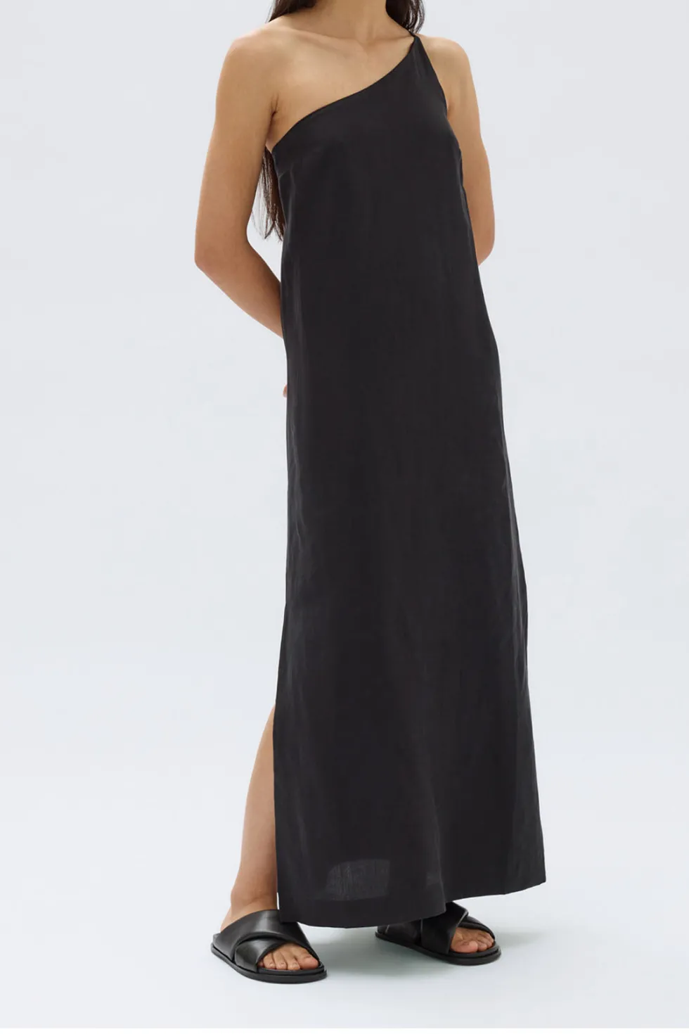 The Farriday Linen Silk Asymmetrical Midi Dress by Assembly Label is crafted from a silk-cotton blend. Featuring a thin shoulder strap, side splits, and an invisible side zipper. True to size and lightweight, the Farriday is half lined.