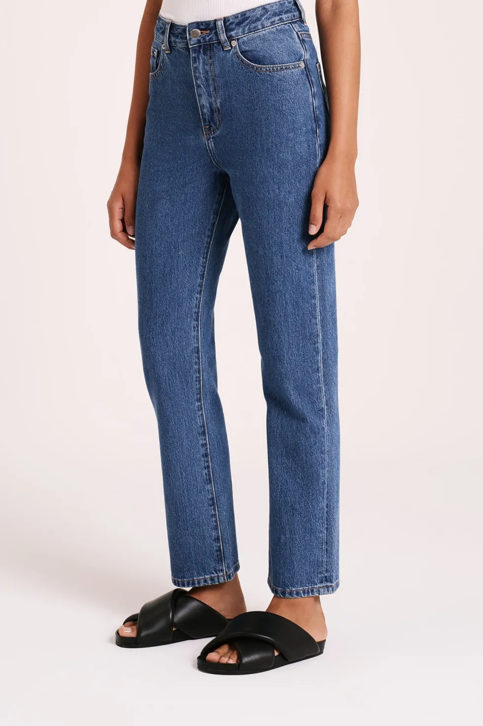 A classic straight leg jean made from 12 oz 100% organic cotton denim, stone washed to an authentic vintage blue. Shape is a slim straight leg with high rise & fitted waist. Features include branded shank button, rivets & Jacron Back patch. Fits true to size, size up for a more relaxed fit.