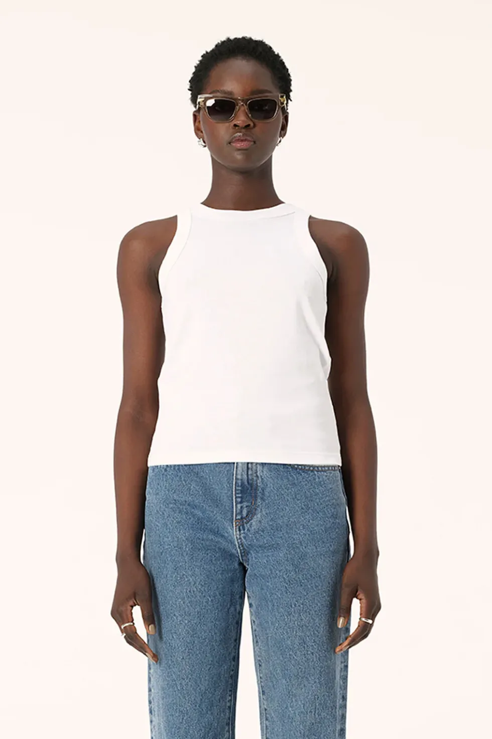 The Zoe Tank in white is a true wardrobe staple. With a classic sleeveless design, crew neckline, and regular fit, this tank is sleek and comfortable. The wide self-bind finishing on the neckline and arm holes sets it apart with an elevated look ideal for pairing with jeans and suiting options.
