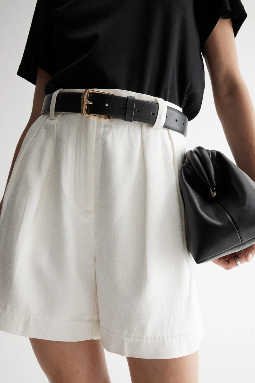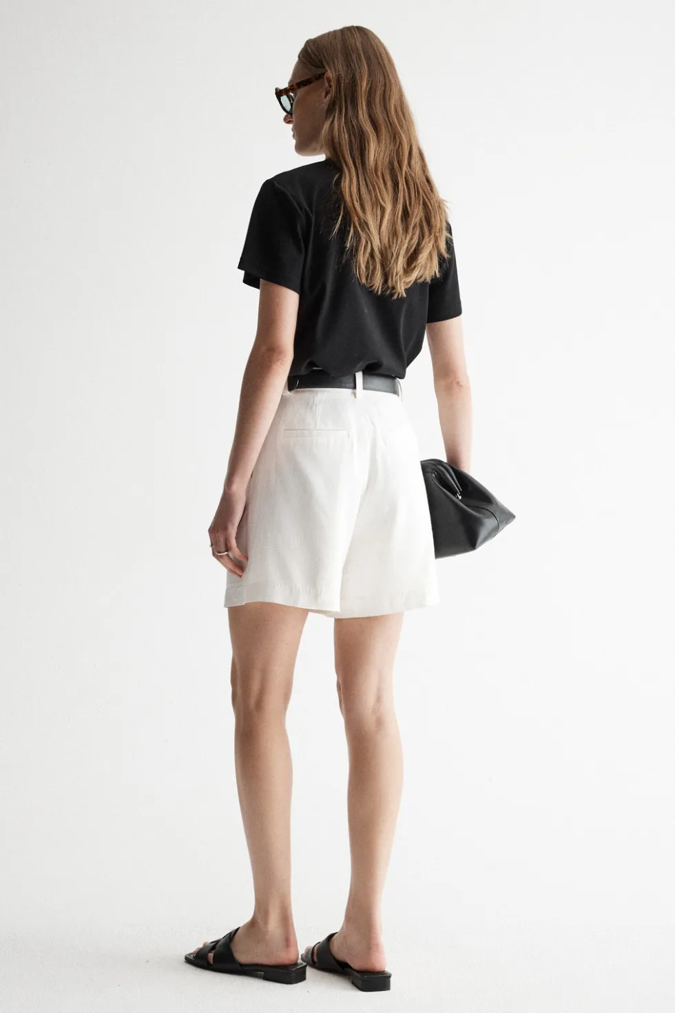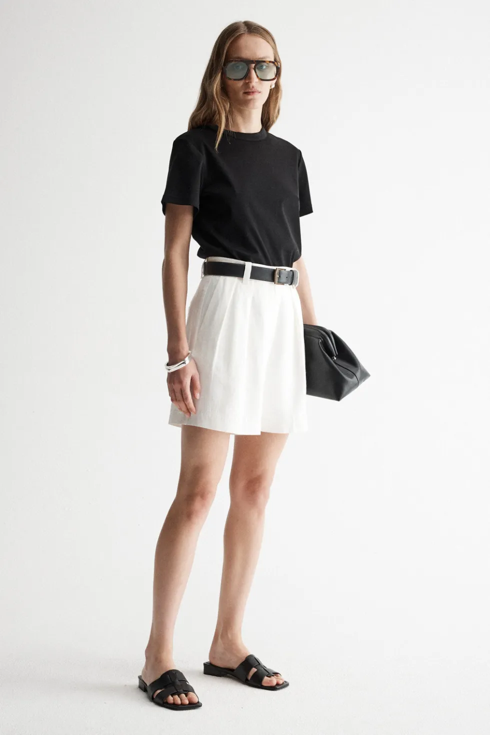 These classic tailored shorts are made from a natural acetate fabric in a white colour way that will elevate your summer wardrobe. These shorts feature a high waist with button and zip fly, front pleat detailing, side cut-away pockets, and a wide leg. A relaxed fit from hip through to mid-thigh, the Marbella Short prioritises comfort for day to night wear. Wear with slim fit knit and tank top styles to combat the heat.