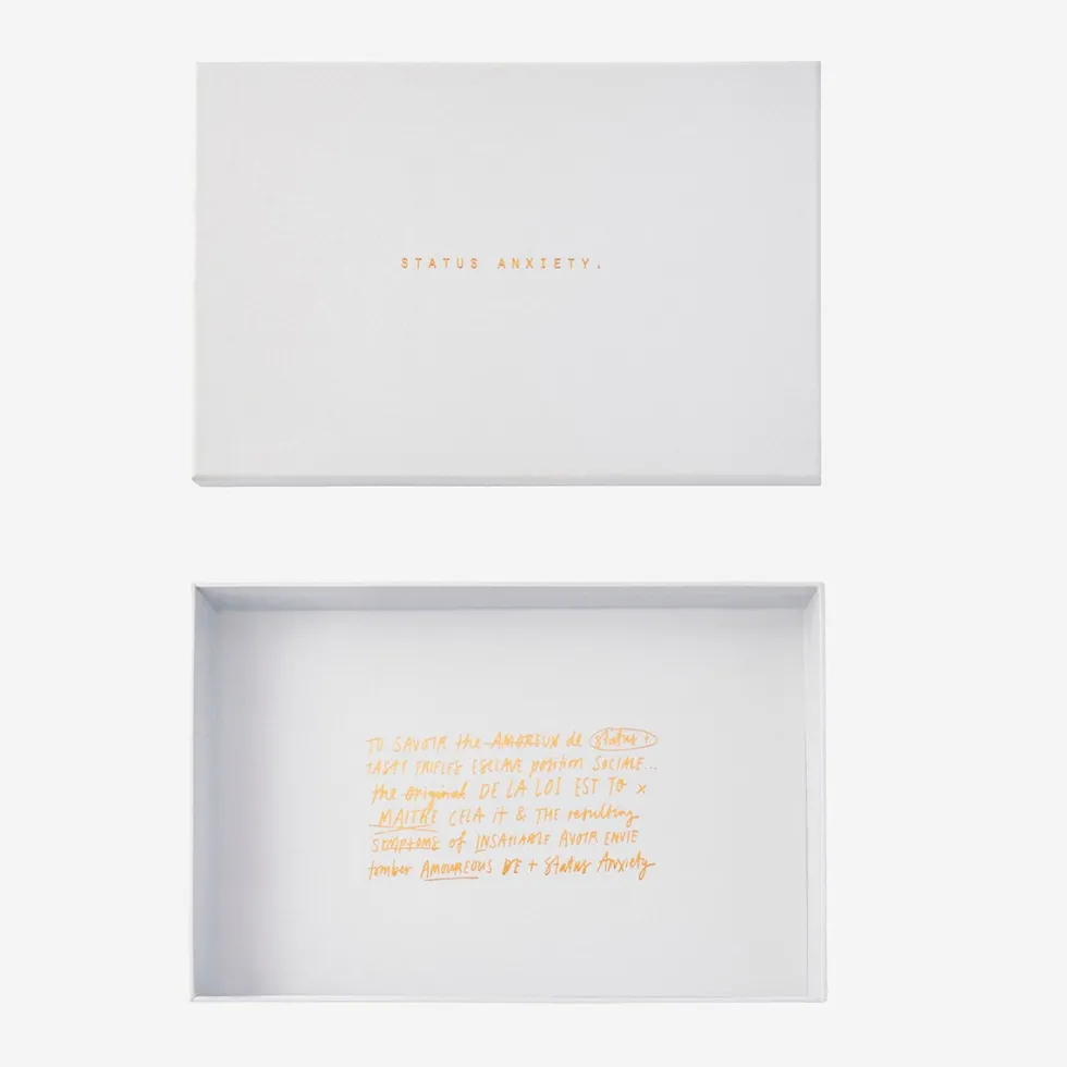 - Comes in a recycled cardstock Status Anxiety box