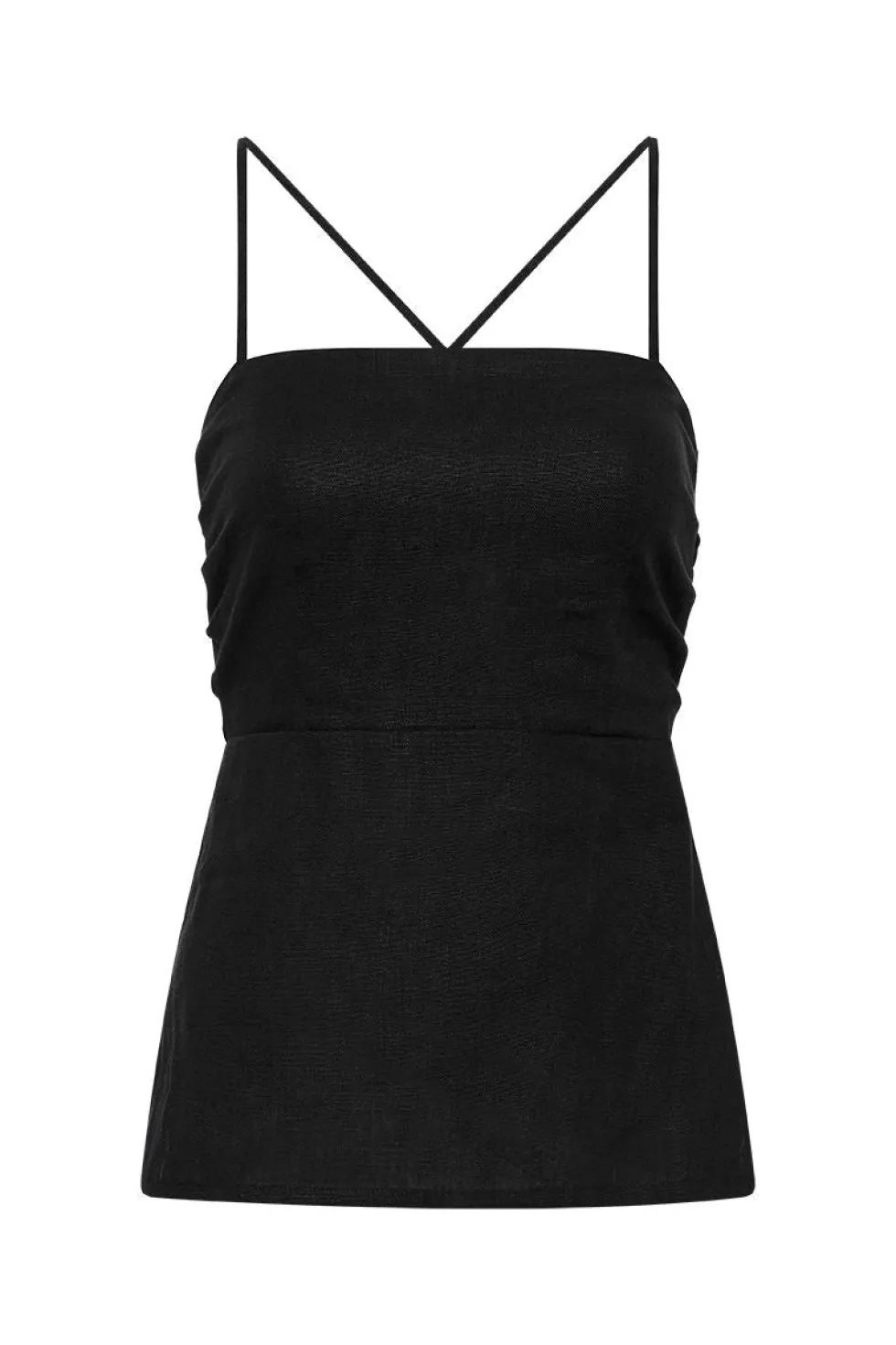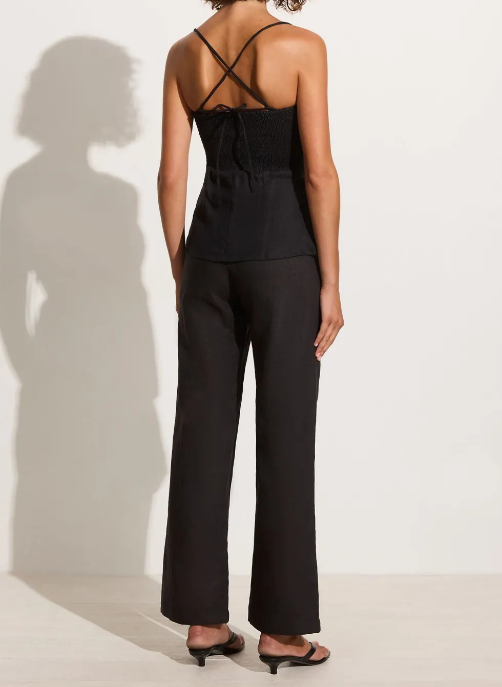 The Marcelo Top is a tailored essential, cut from breathable linen and hand-dyed in staple Black. Designed for easy-wear and versatility, this top offers a square neckline, shirred back panel for comfort, peplum hem, side splits and straps designed to be tied in multiple ways. Style it with the Vincente Pants and strap heels for a refineddeskto dinner ensemble.