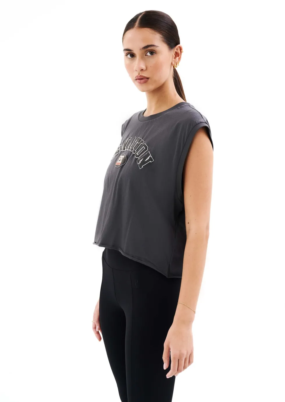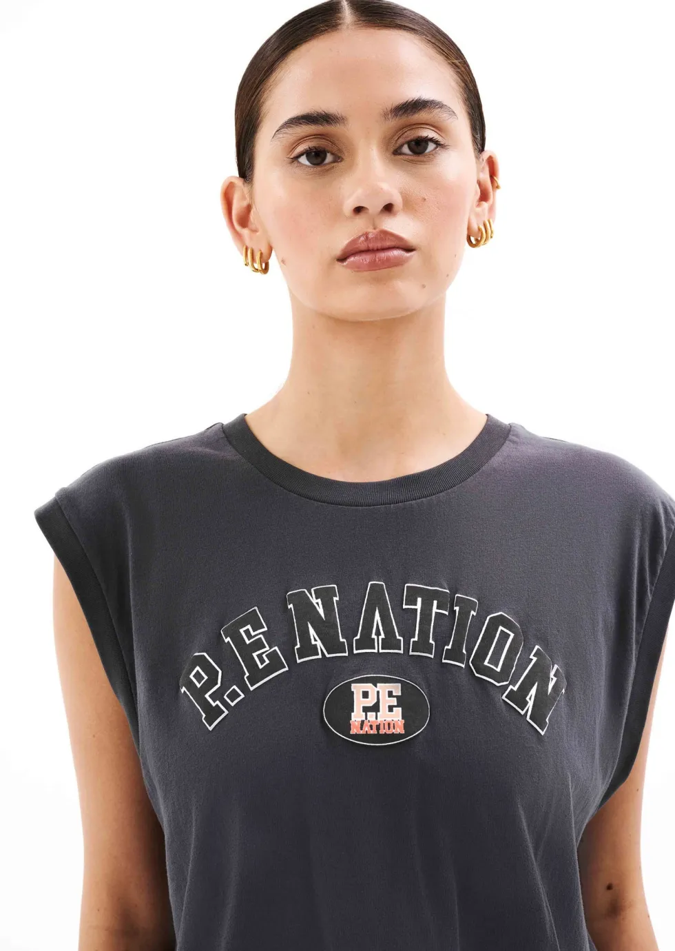 TheSolrad Tank in Dark Shadow by P.E Nation,designed to be worn from workout to water. A lightweight cropped T-shirt featuring buttery soft organic cotton jersey, take your all day looks to the next level with the Solrad Tank.