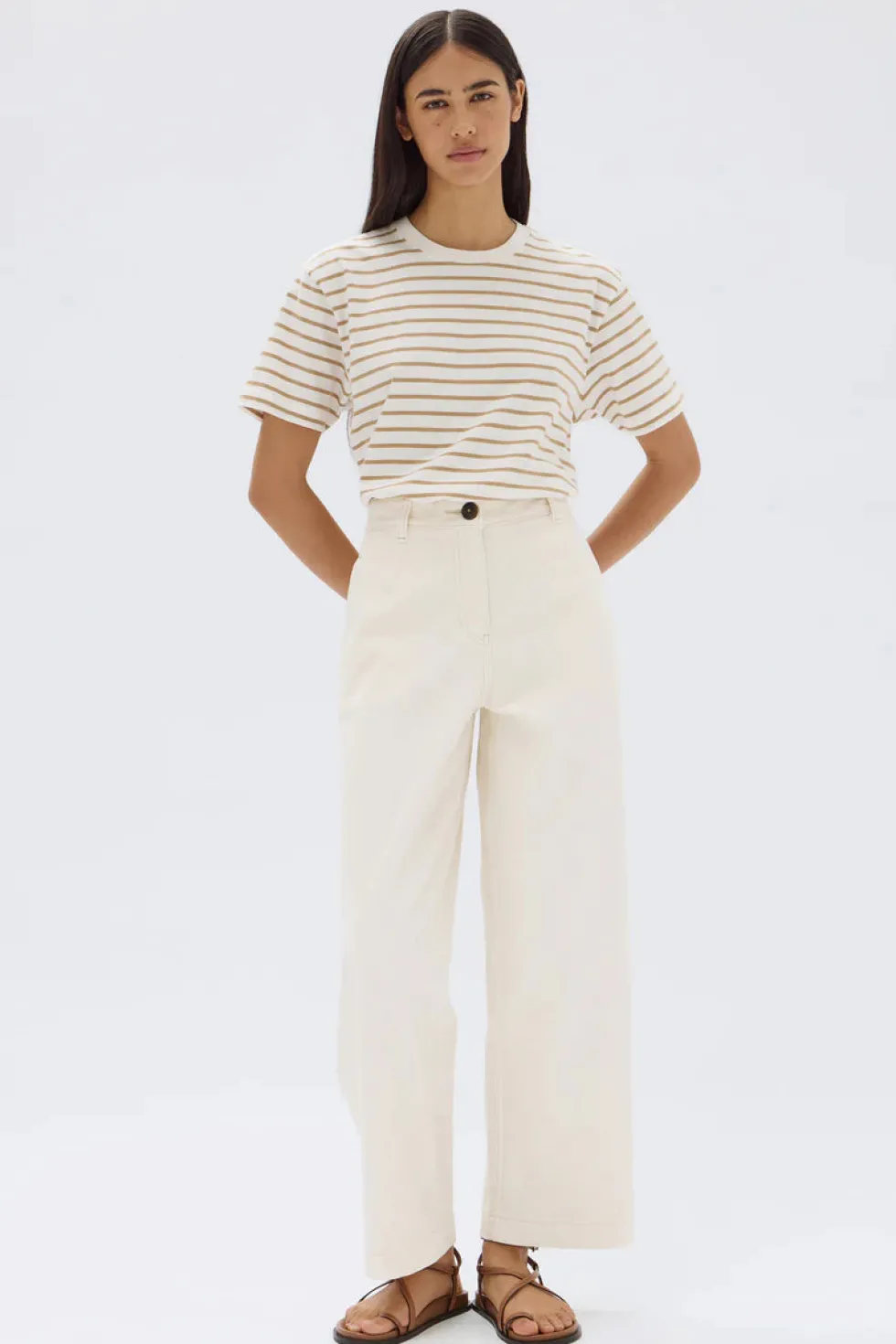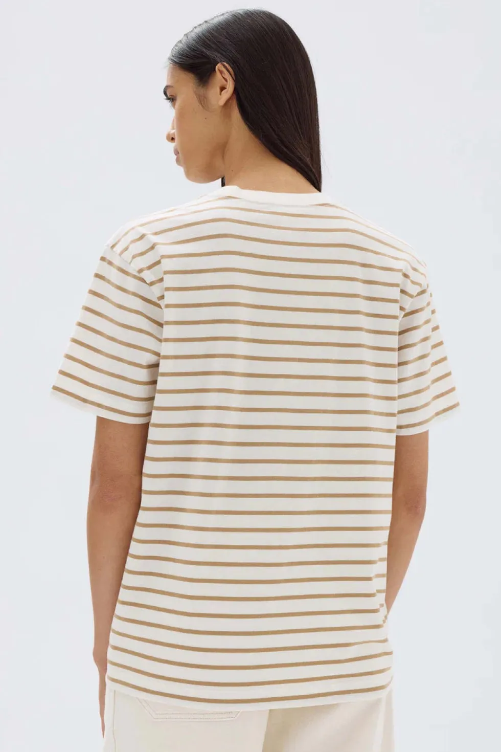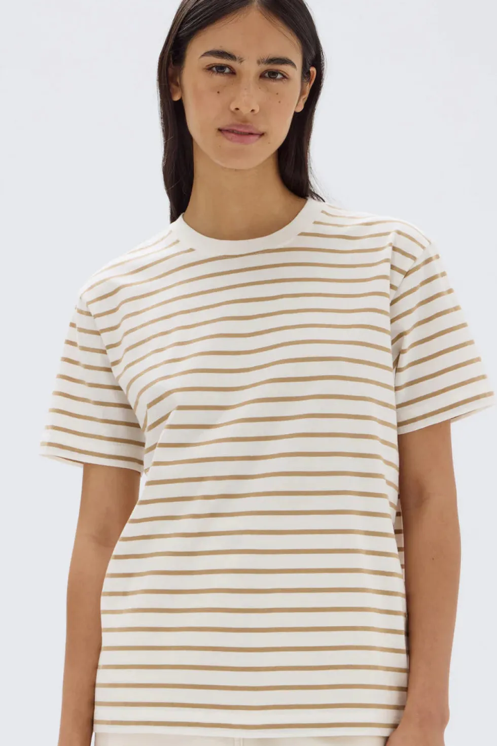 The Women Port Stripe Tee in White / Tan from Assembly Label is a relaxed fit tee featuring a cotton rib neckline. Details include striped fabrication and a boxy fit.