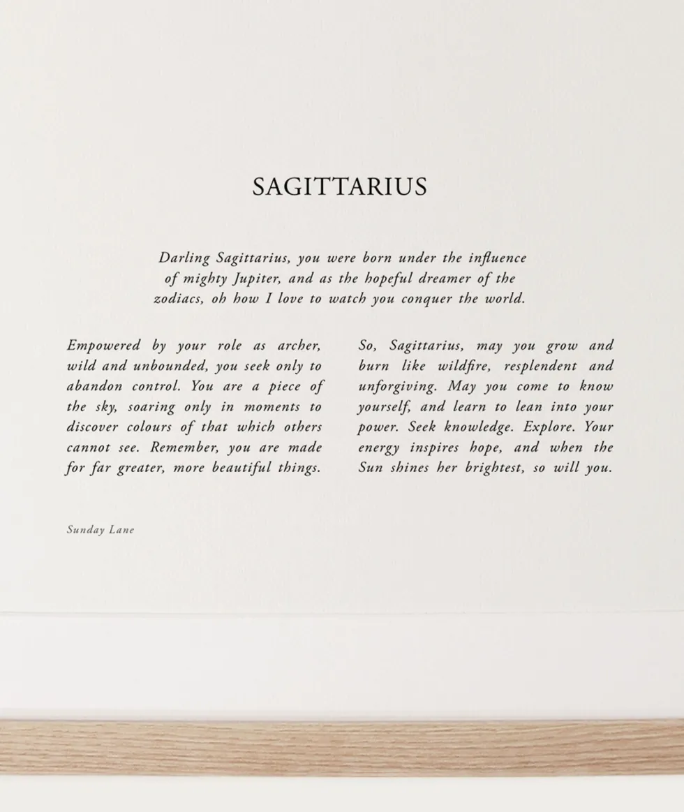 Zodiac 04 Collection Sagittarius November 22 – December 21 ‘Darling Sagittarius, you were born under the influence of mighty Jupiter, and as the hopeful dreamer of the zodiacs, oh how I love to watch you conquer the world.’ Written and illustrated by Caitlyn Everett, in our Sunshine Coast studio. Printed onto 215gsm off-white felt card.