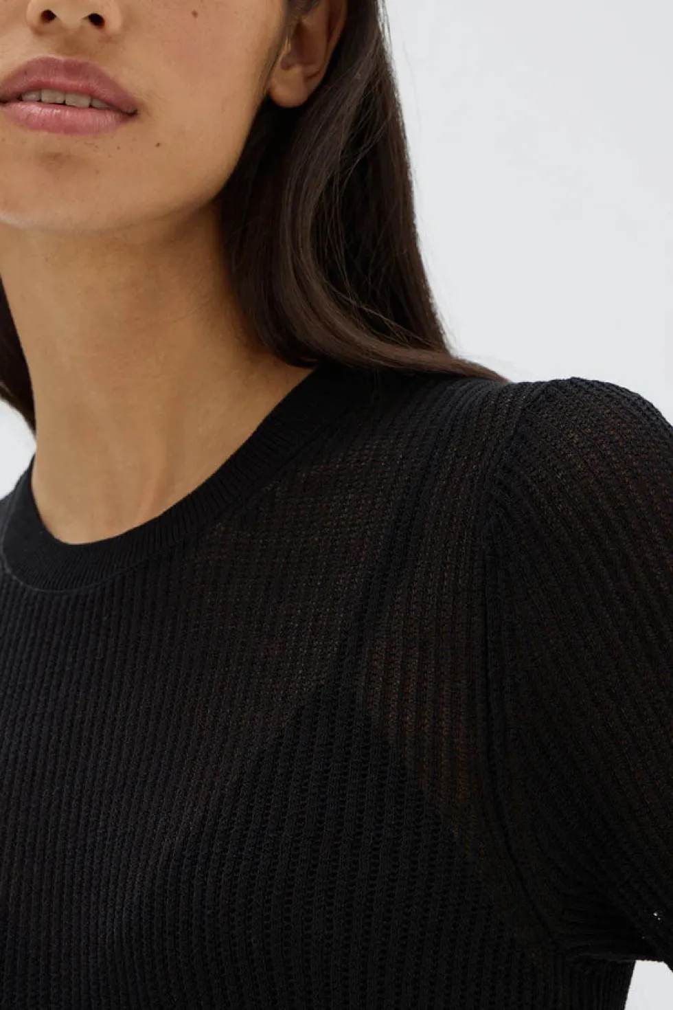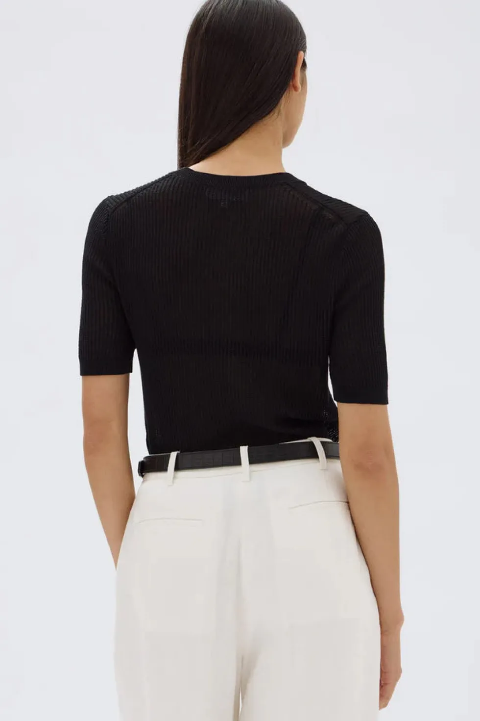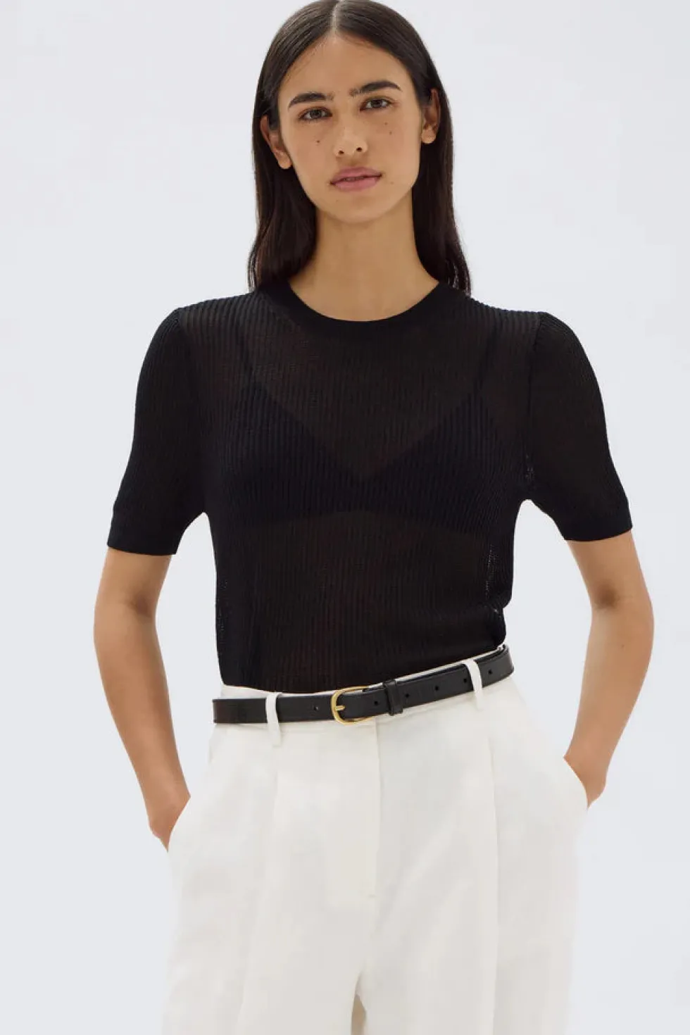The Belle Knit Short Sleeve Tee is an elevated short-sleeve tee. Crafted from a slightly sheer rib stitch, the Belle is perfect for warm weather. Style with denim or linen bottoms.