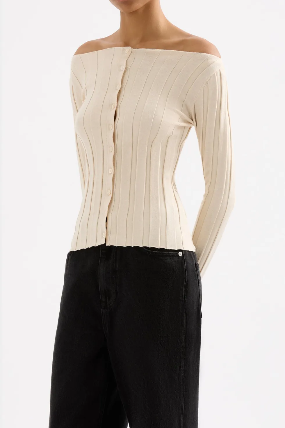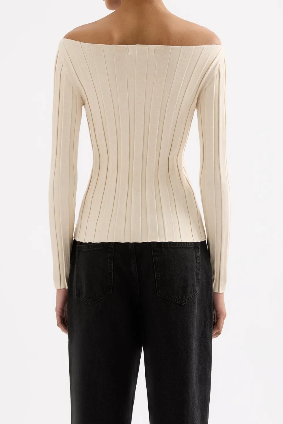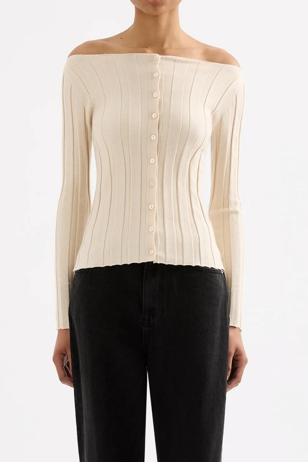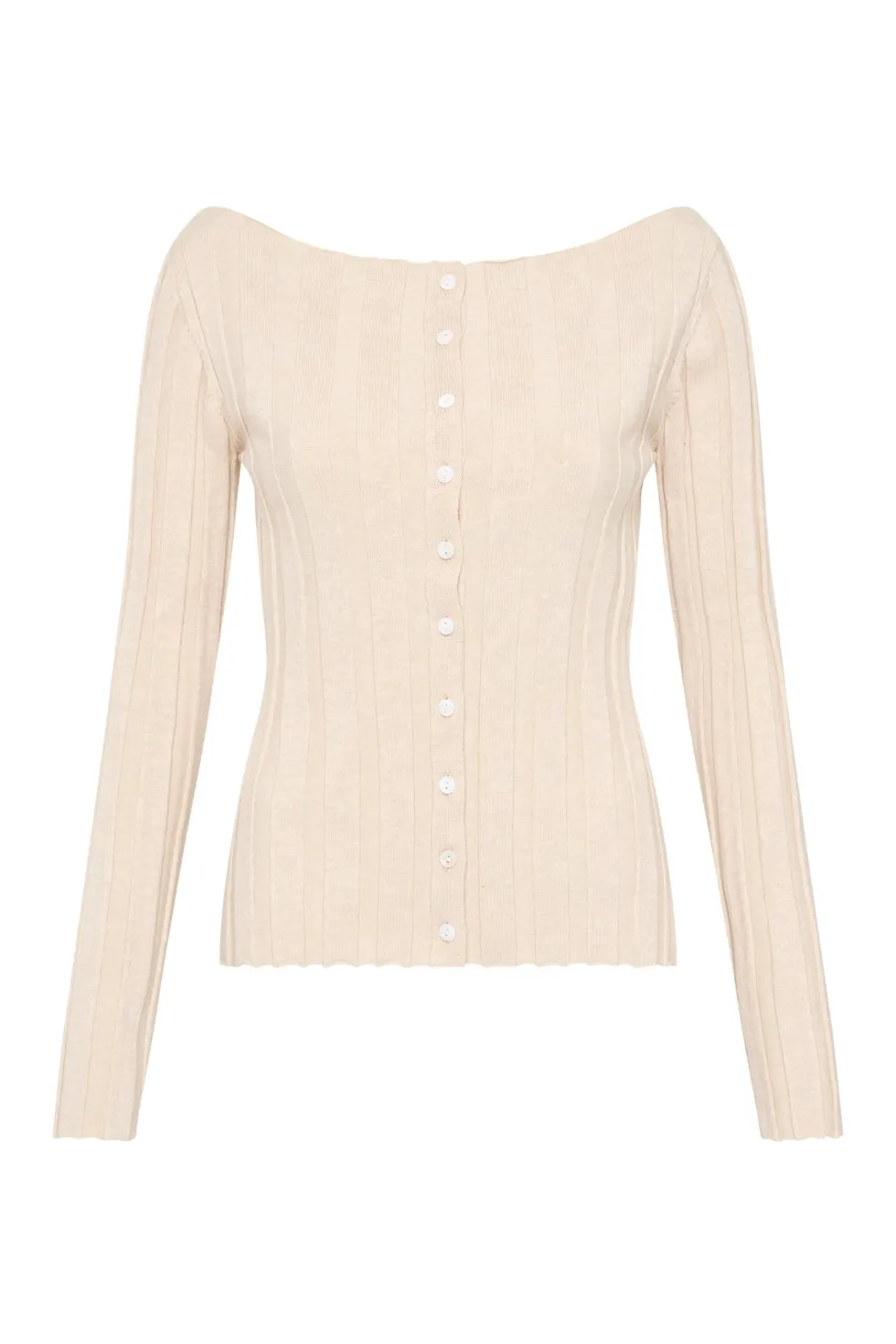 The Aneke Knit Top from Nude Lucy is made from a lightweight cotton blend yarn which is soft in feel. The silhouette is slim fitting with full length sleeves and its length sitting at hip level. Features include wide rib pattern construction through the body, boat neckline and shell buttons.