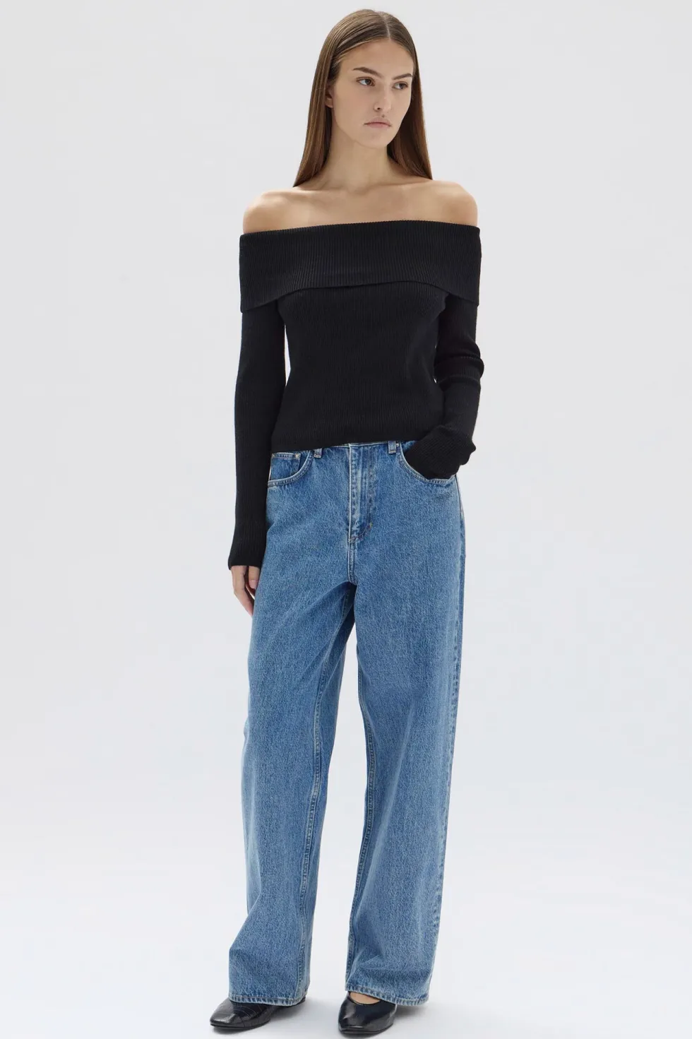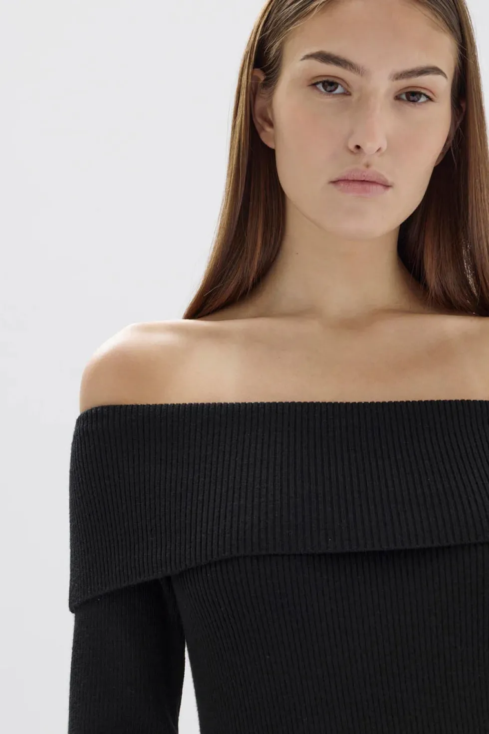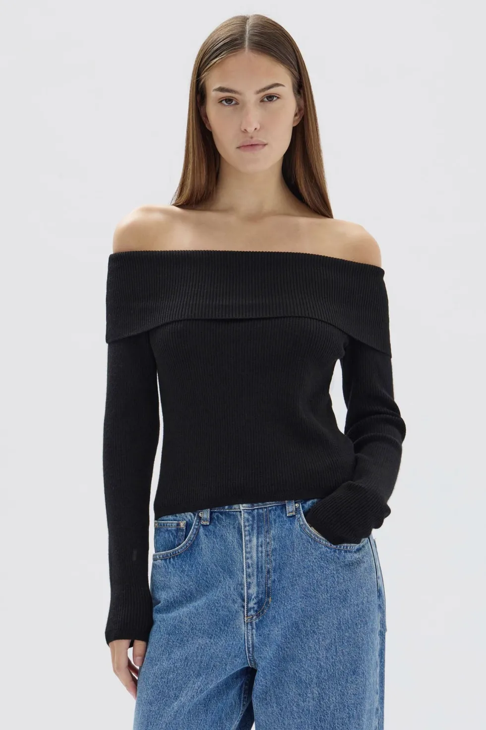 Ribbed knit long sleeve off the shoulder top. Fitted silhouette, crafted with merino wool.90% Merino Wool | 10% Elastane…