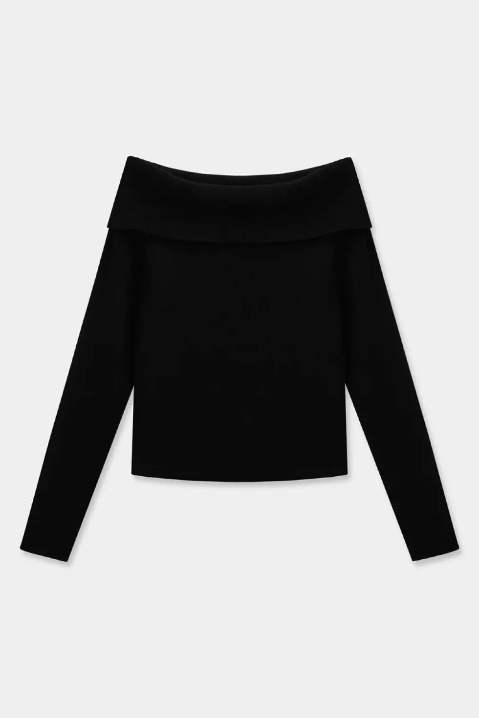 Ribbed knit long sleeve off the shoulder top. Fitted silhouette, crafted with merino wool.