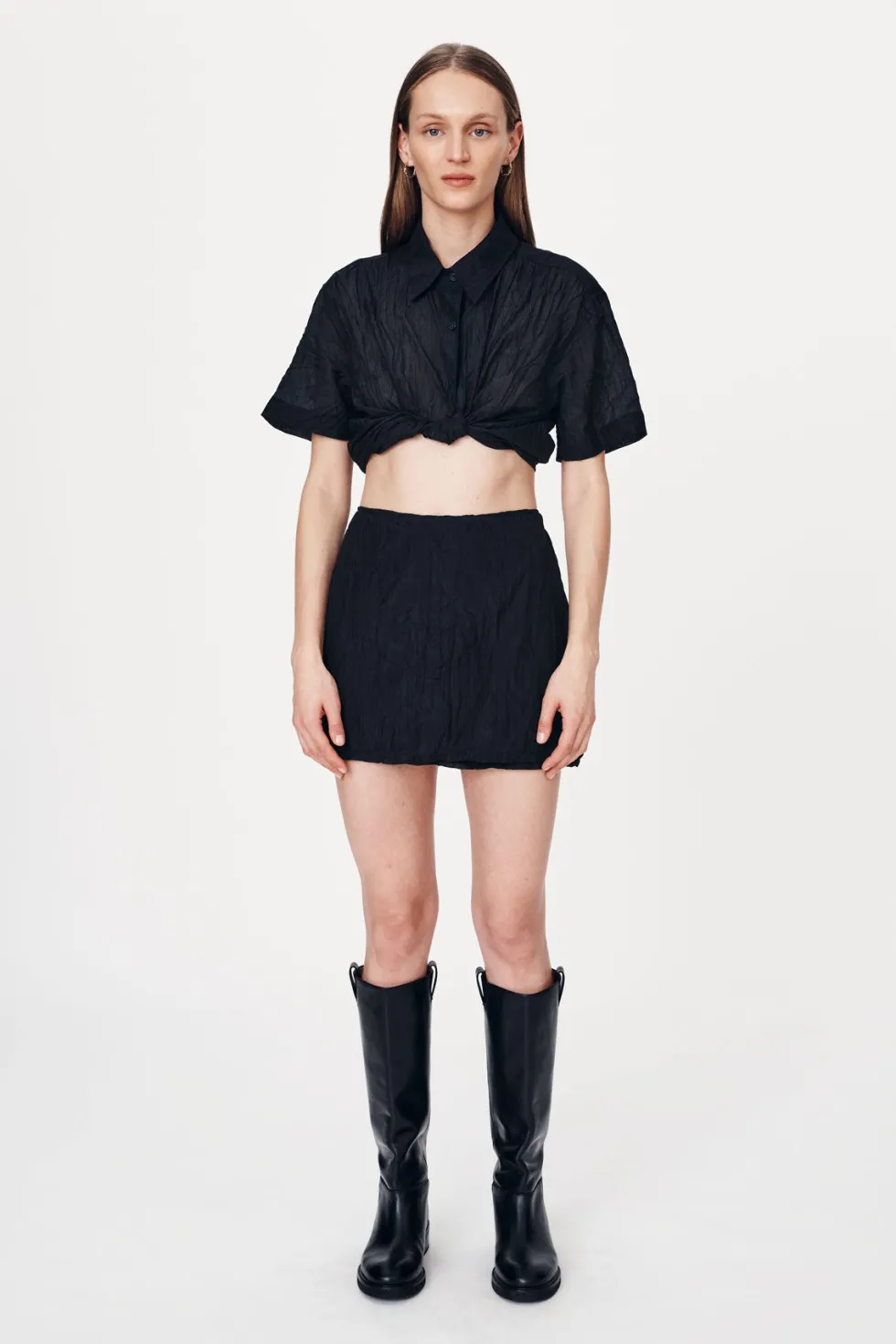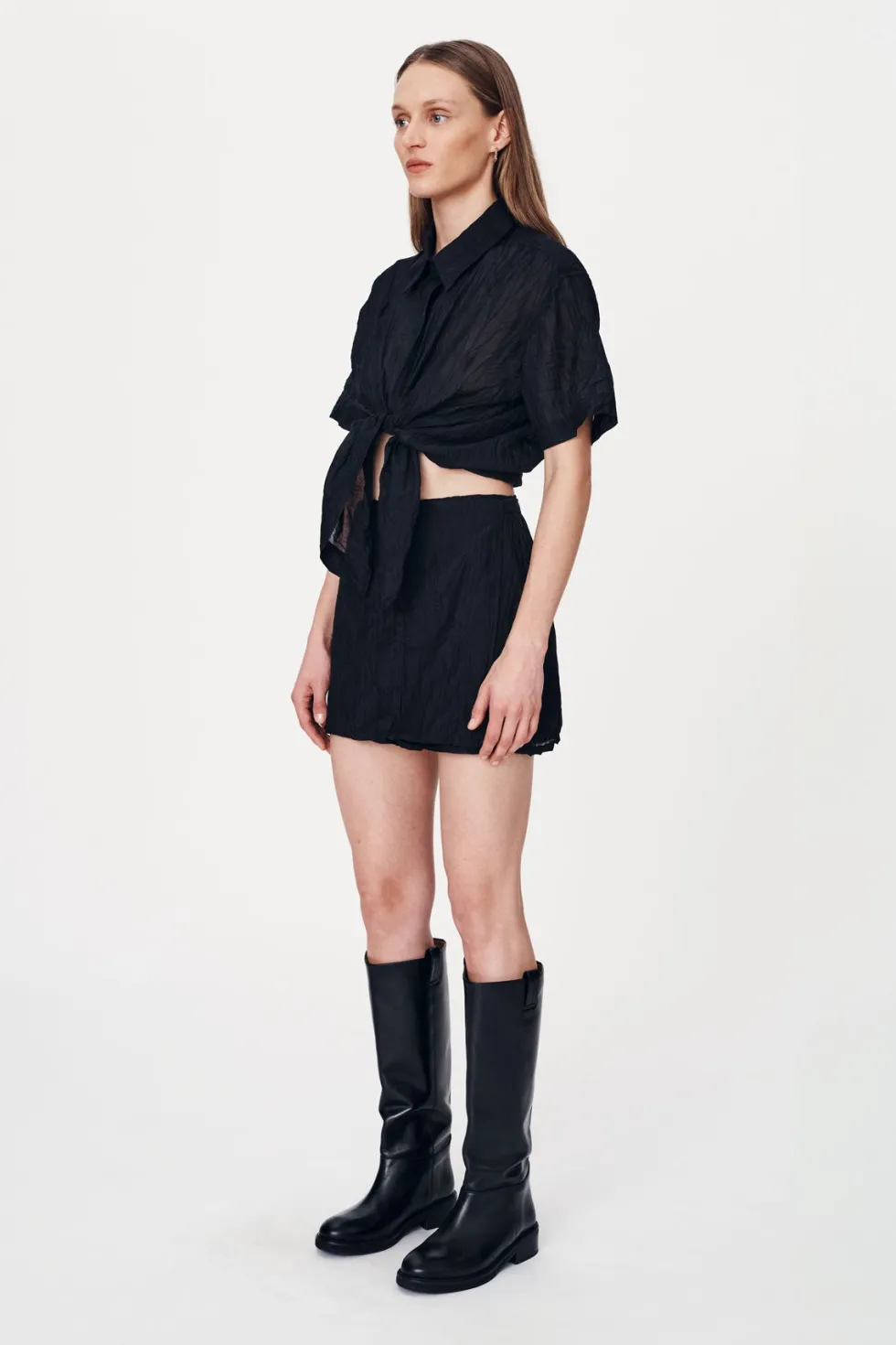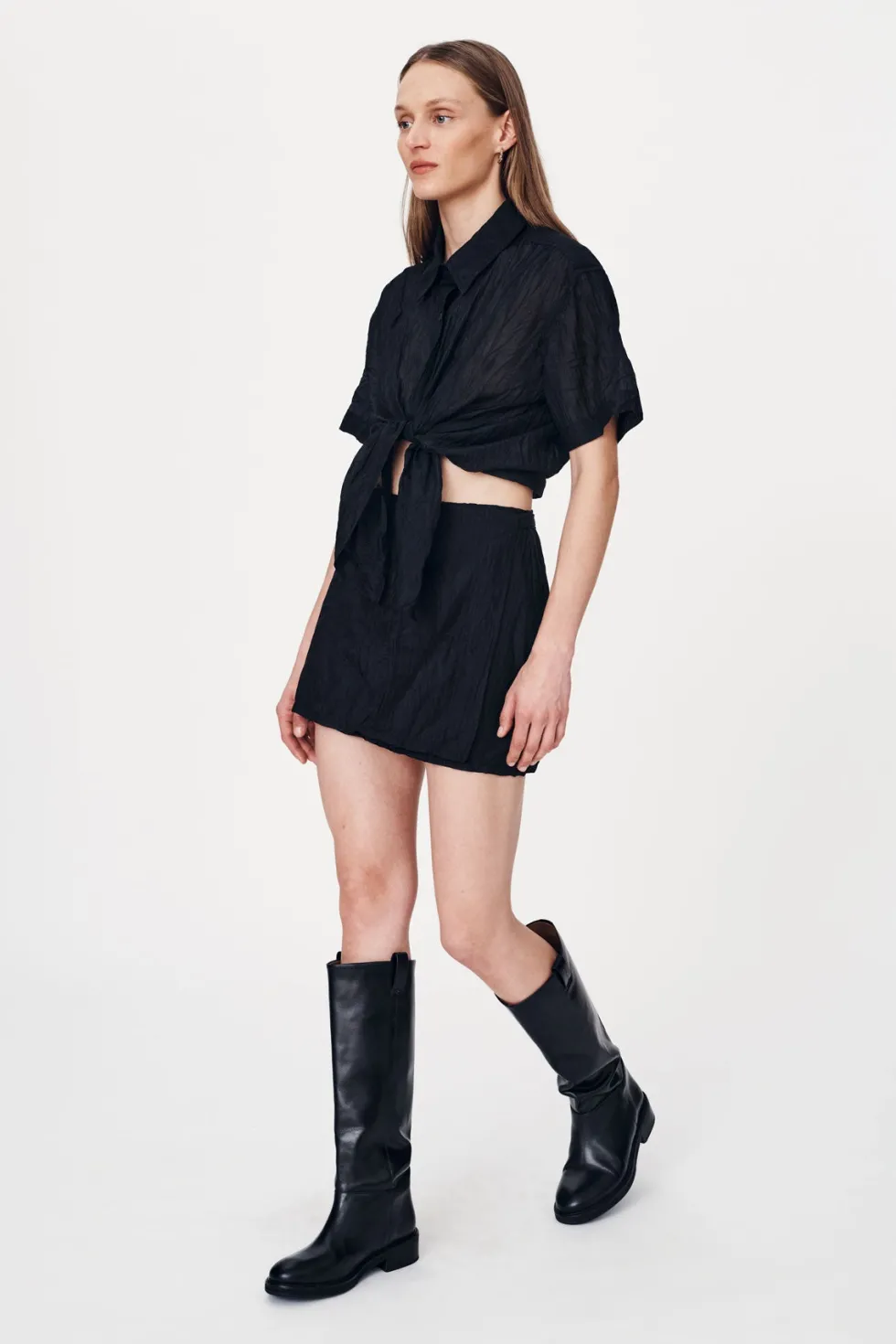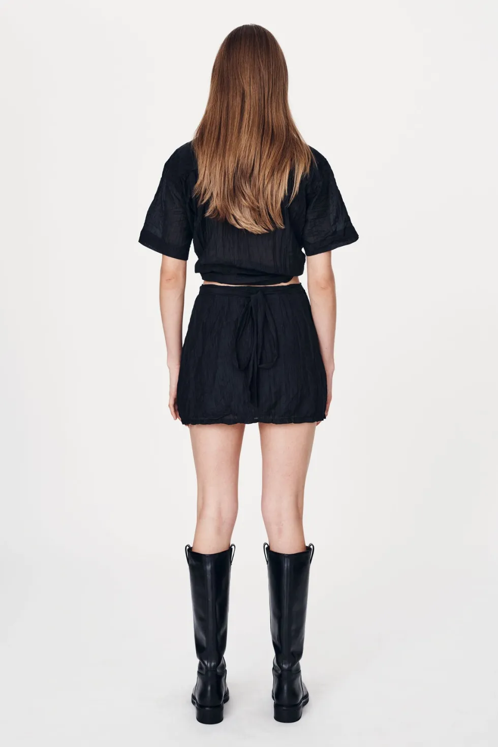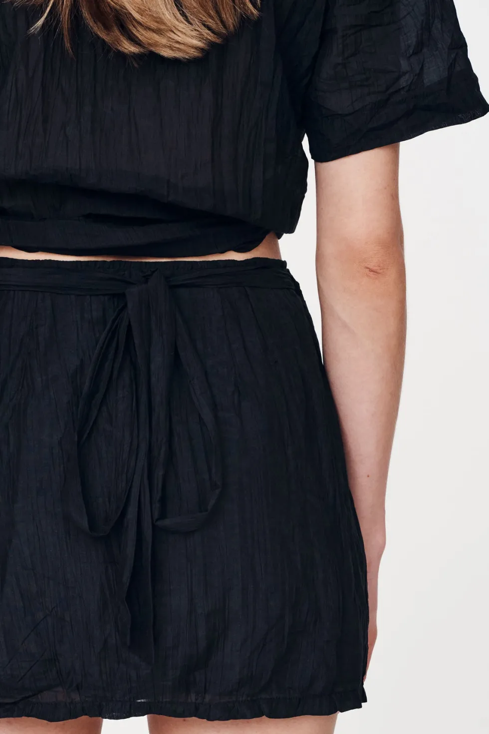 High-waisted wrap mini skirt Cross-over wrap front and adjustable side tie Functional belt loops Fully lined