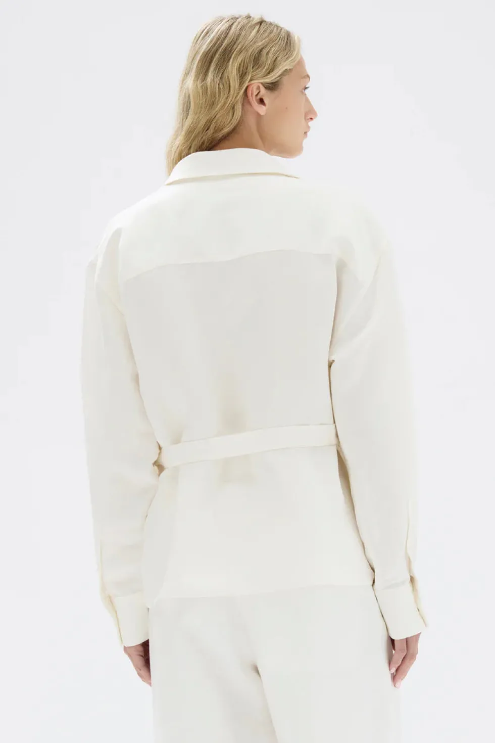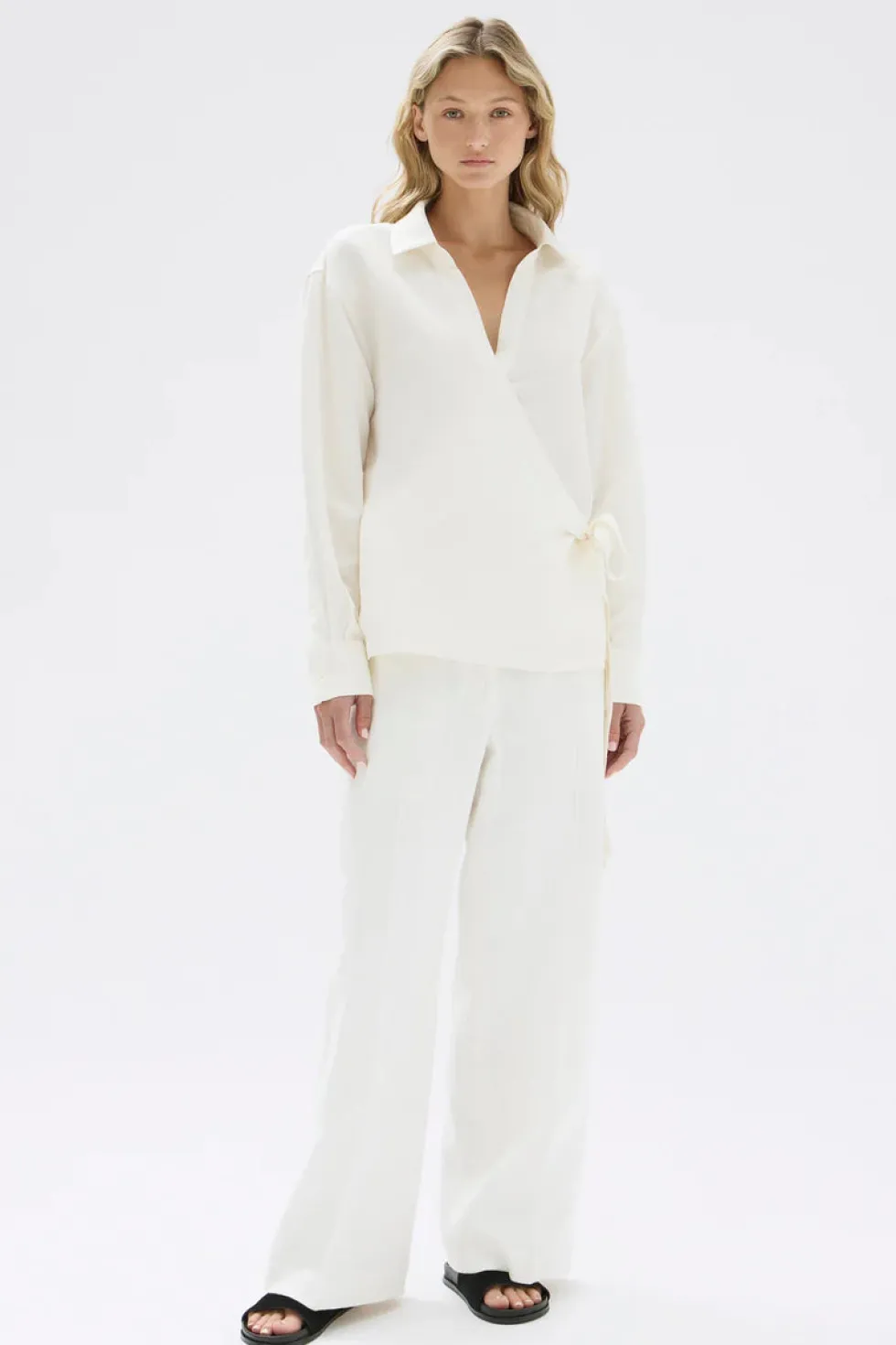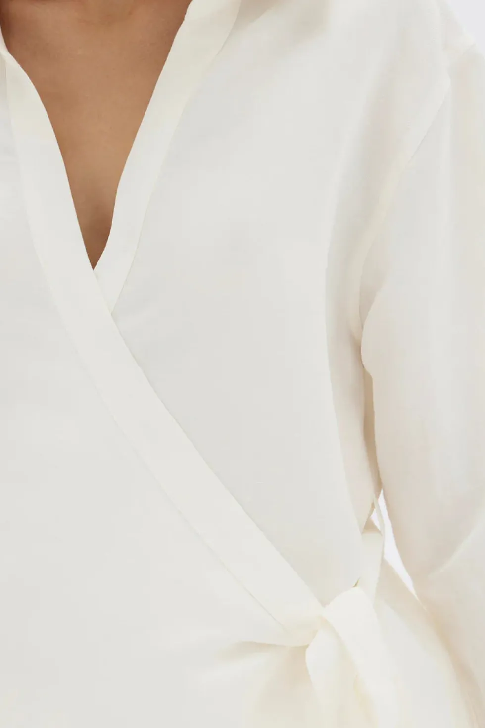 An effortless long sleeve wrap shirt composed of a soft linen and silk blend. Features include a waist tie closure and collar, long sleeves and cuff opening.