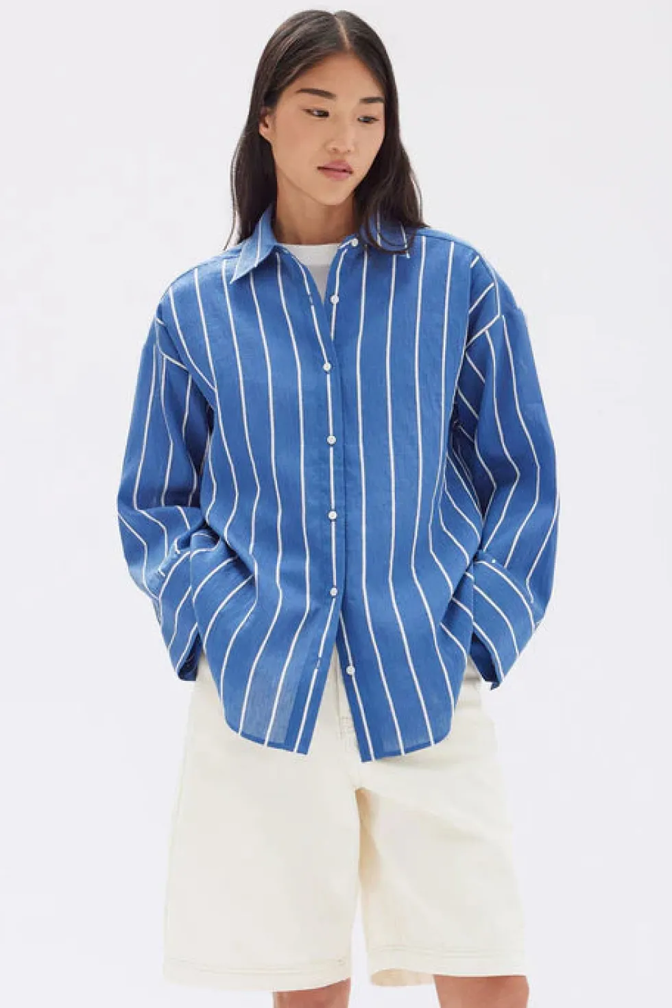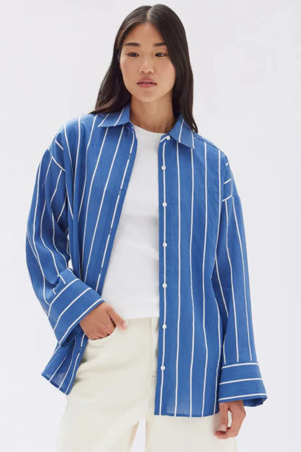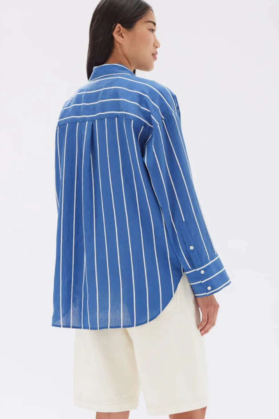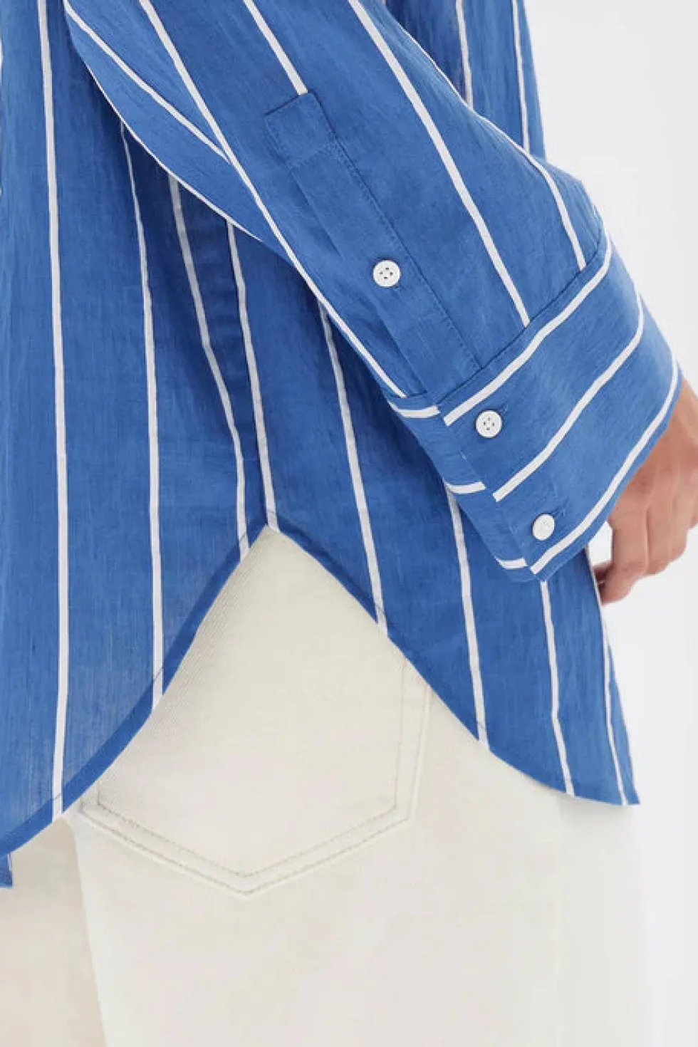 4-hole white shell button front opening – Wide sleeves and cuff opening – Oversized fit with dropped shoulder – Shaped hem finish – Slightly sheer