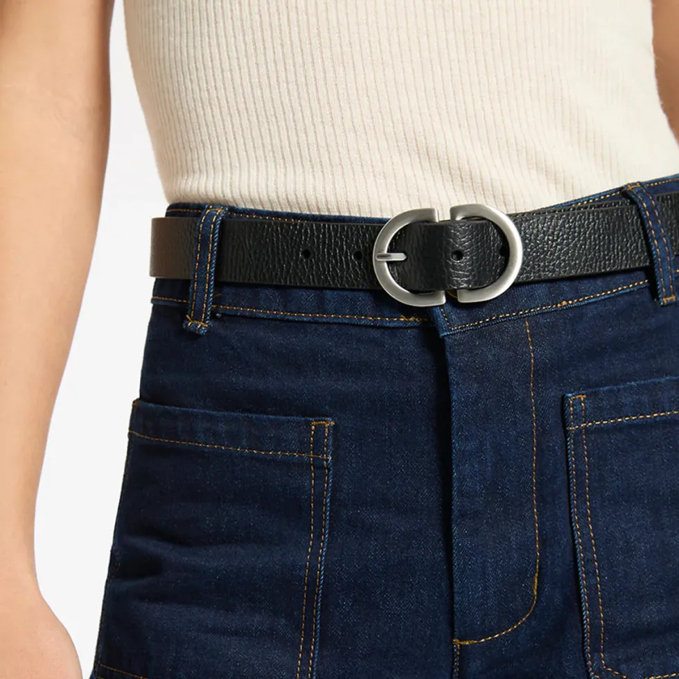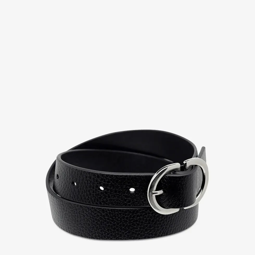 Status Anxiety ‘In Reverse Belt’ in black and silver. Features include, a premium hardware buckle, logo emboss detail on back. Crafted in a premium cowhide pebble leather.