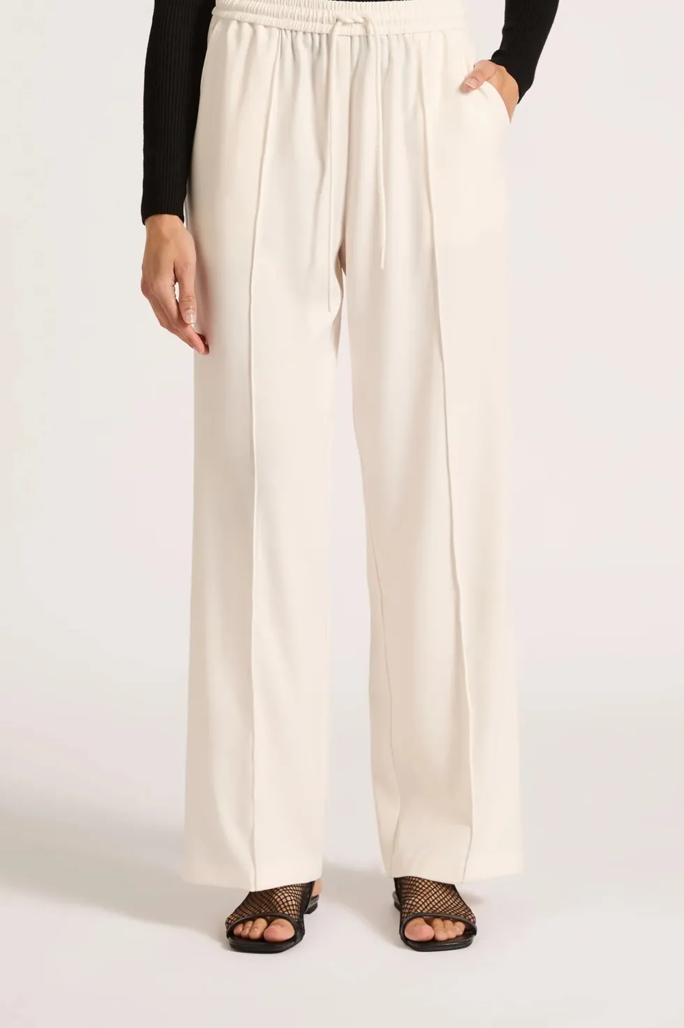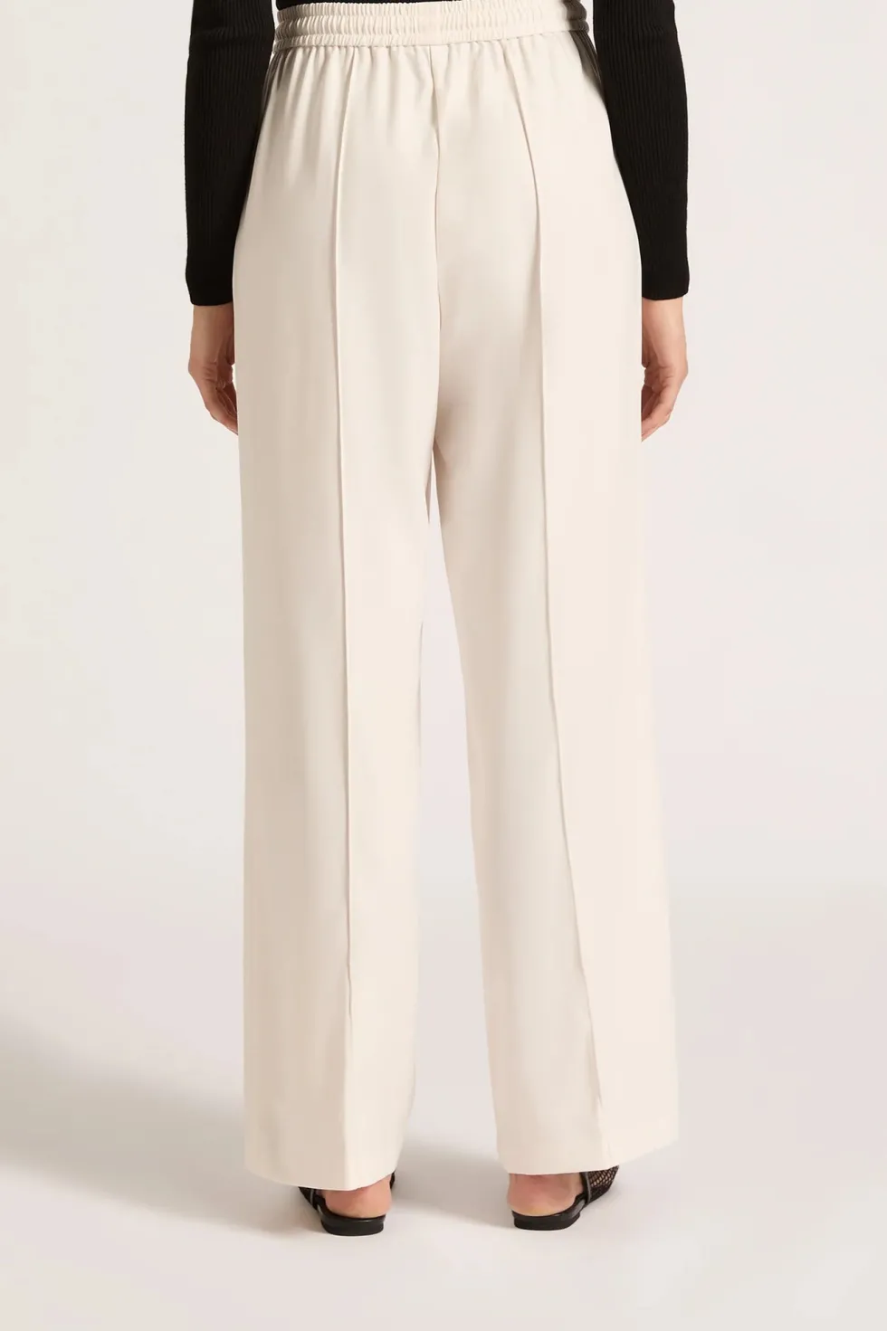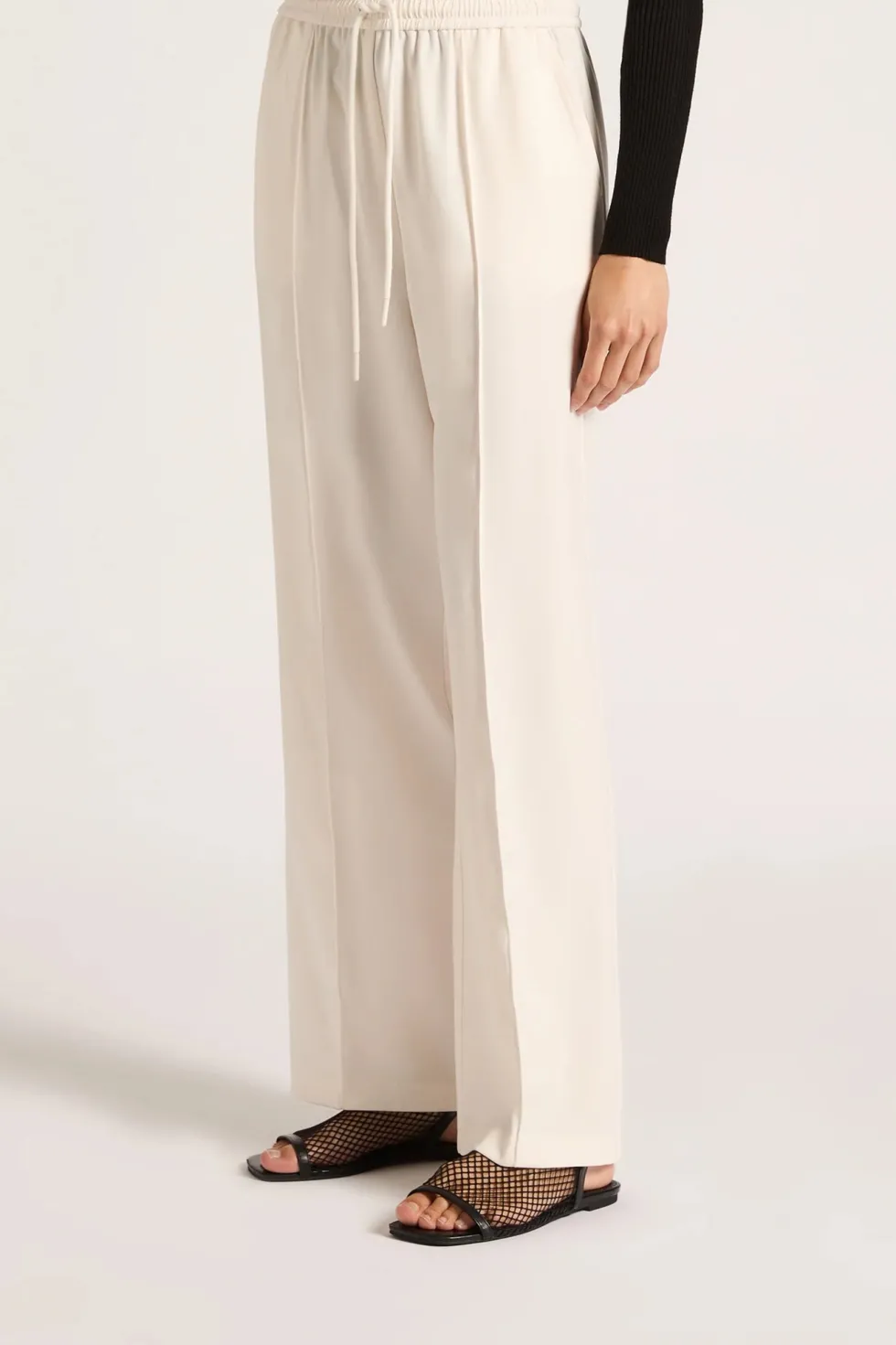 The Quincy Pant is made from a lightweight tailoring fabric. The silhouette is relaxed with a wide full length leg. Features include an elasticated waistband with an external draw cord, pin stitch down the centre of the legs, and side seam pockets.