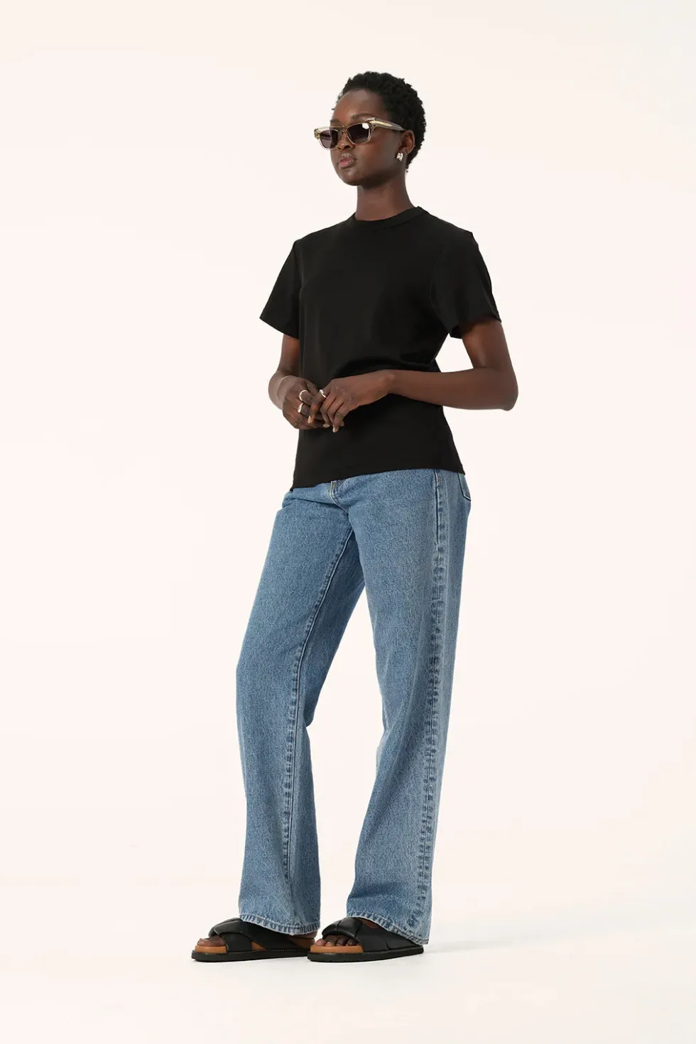 The Zoe Tee in black is a true wardrobe staple. Crafted from our soft organic cotton this t-shirt is a sleek and comfortable option for easy casual outfitting in any season. With a classic short sleeve design, crew neckline, and slightly oversized, boxy fit, the Zoe Tee can be styled with all skirts, jeans and suiting options from work to weekend.